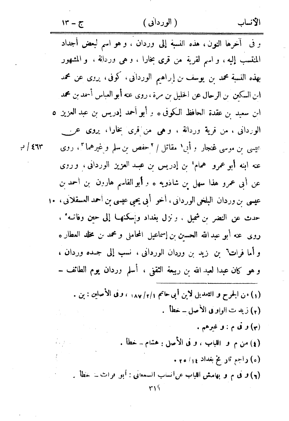 وفي آخرها النون، هذه النسبة إلى وردان، وهو اسم لبعض أجداد المنتسب إليه، واسم لقرية من قرى بخارا، وهي وردانة، والمشهور بهذه النسبة محمد بن يوسف بن إبراهيم الورداني، كوفى، يروى عن محمد ابن السكين بن الرحال عن الخليل بن مرة، روى عنه أبو العباس أحمد بن محمد ابن سعيد بن عقدة الحافظ الكوفي وأبو أحمد إدريس بن عبد العزيز الورداني، من قرية وردانة، وهي من قرى بخارا، يروى عن عيسى بن موسى غنجار وأبى [1] مقاتل/ [2] حفص بن سلم وغيرهما [3] ، روى عنه ابنه أبو عمرو همام [4] بن إدريس بن عبد العزيز الورداني، وروى عن أبى عمرو هذا سهل بن شاذويه وأبو القاسم هارون بن أحمد بن عيسى بن وردان البلخي الورداني، أخو أبى يحيى عيسى بن أحمد العسقلاني، حدث عن النضر بن شميل، ونزل بغداد وسكنها إلى حين وفاته [5] ، روى عنه أبو عبد الله الحسين بن إسماعيل المحاملي ومحمد بن مخلد العطار وأما فرات [6] بن زيد بن وردان الورداني، نسب إلى جده وردان، وهو كان عبدا لعبد الله بن ربيعة الثقفي، أسلم وردان يوم الطائف-