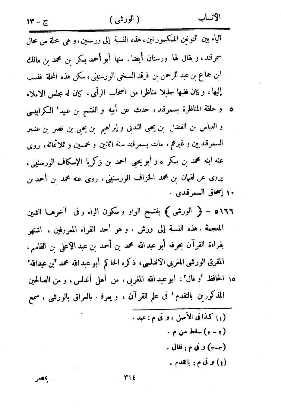 بفتح الواو وسكون الراء وفي آخرها الشين المعجمة، هذه النسبة إلى ورش، وهو أحد القراء المعروفين، اشتهر بقراءة القرآن بحرفه أبو عبد الله محمد بن أحمد بن عبد الأعلى بن القاسم، المقرئ الورشى المغربي الأندلسى، ذكره الحاكم أبو عبد الله محمد [2] بن عبد الله [2] الحافظ [3] وقال [3] : أبو عبد الله المغربي، من أهل أندلس، ومن الصالحين المذكورين بالتقدم [4] في علم القرآن، ويعرف بالعراق بالورشى، سمع