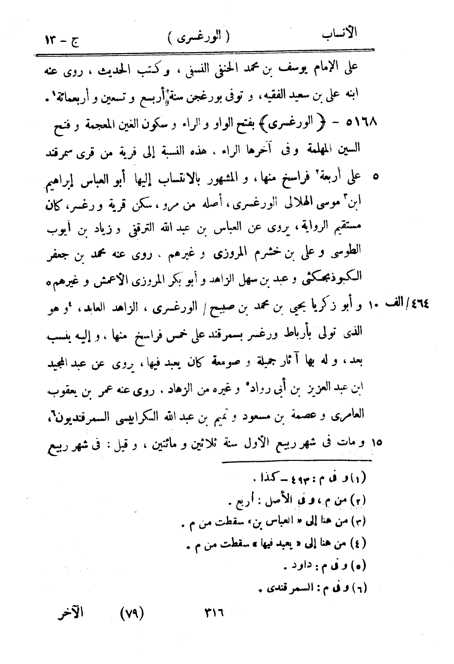 بفتح الواو والراء وسكون الغين المعجمة وفتح السين المهملة وفي آخرها الراء، هذه النسبة إلى قرية من قرى سمرقند على أربعة [2] فراسخ منها، والمشهور بالانتساب إليها أبو العباس إبراهيم ابن [3] موسى الهلالي الورغسرى، أصله من مرو، سكن قرية ورغسر، كان مستقيم الرواية، يروى عن العباس بن عبد الله الترقفي وزياد بن أيوب الطوسي وعلى بن خشرم المروزي وغيرهم، روى عنه محمد بن جعفر الكبوذنجكثي وعبد بن سهل الزاهد وأبو بكر المروزي الأعمش وغيرهم وأبو زكريا يحيى بن محمد بن صبيح/ الورغسرى، الزاهد العابد، [4] وهو الّذي تولى بأرباط ورغسر بسمرقند على خمس فراسخ منها، وإليه ينسب بعد، وله بها آثار جميلة وصومعة كان يعبد فيها، يروى عن عبد المجيد ابن عبد العزيز بن أبى رواد [5] وغيره من الزهاد، روى عنه عمر بن يعقوب العامري وعصمة بن مسعود وتميم بن عبد الله الكرابيسي السمرقنديون [6] ، ومات في شهر ربيع الأول سنة ثلاثين ومائتين، وقيل: في شهر ربيع