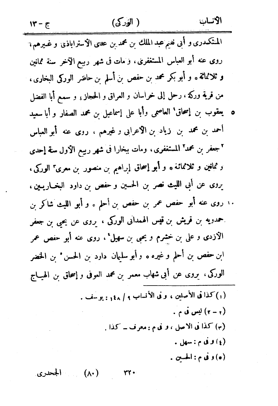 المنكدرى وأبى نعيم عبد الملك بن محمد بن عدي الأستراباذي وغيرهم، روى عنه أبو العباس المستغفري، ومات في شهر ربيع الآخر سنة ثمانين وثلاثمائة وأبو بكر محمد بن حفص بن أسلم بن حاضر الوركى البخاري، من قرية وركة، رحل إلى خراسان والعراق والحجاز، وسمع أبا الفضل يعقوب بن إسحاق [1] العاصمي وأبا على إسماعيل بن محمد الصفار وأبا سعيد أحمد بن محمد بن زياد بن الأعرابي وغيرهم، روى عنه أبو العباس [2] جعفر بن محمد [2] المستغفري، ومات ببخارا في شهر ربيع الأول سنة إحدى وثمانين وثلاثمائة وأبو إسحاق إبراهيم بن منصور بن معرى [3] الوركى، يروى عن أبى الليث نصر بن الحسين وحفص بن داود البخاريين، روى عنه أبو حفص عمر بن حفص بن أحلم وأبو الليث شاكر بن حمدويه بن قريش بن قيس الهمدانيّ الوركى، يروى عن يحيى بن جعفر الأزدي وعلى بن خشرم ويحيى بن سهيل [4] ، روى عنه أبو حفص عمر ابن حفص بن أحلم وغيره وأبو سليمان داود بن الحسن [5] بن الخضر الوركى، يروى عن أبى شهاب معمر بن محمد العوفيّ وإسحاق بن الهياج