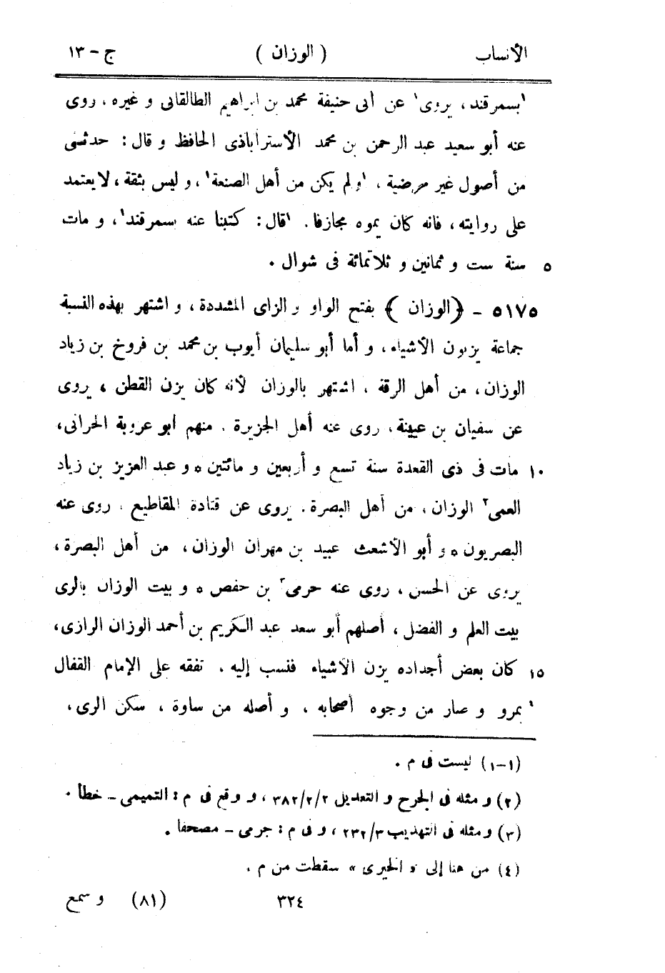 بفتح الواو والزاى المشددة، واشتهر بهذه النسبة جماعة يزنون الأشياء، وأما أبو سليمان أيوب بن محمد بن فروخ بن زياد الوزان، من أهل الرقة، اشتهر بالوزان لأنه كان يزن القطن، يروى عن سفيان بن عيينة، روى عنه أهل الجزيرة، منهم أبو عروبة الحراني، مات في ذي القعدة سنة تسع وأربعين ومائتين وعبد العزيز بن زياد العمى [2] الوزان، من أهل البصرة، يروى عن قتادة المقاطيع، روى عنه البصريون وأبو الأشعث عبيد بن مهران الوزان، من أهل البصرة، يروى عن الحسن، روى عنه حرمي [3] بن حفص وبيت الوزان بالري بيت العلم والفضل، أصلهم أبو سعد عبد الكريم بن أحمد الوزان الرازيّ، كان بعض أجداده يزن الأشياء فنسب إليه، تفقه على الإمام القفال [4] بمرو وصار من وجوه أصحابه، وأصله من ساوة، سكن الري،