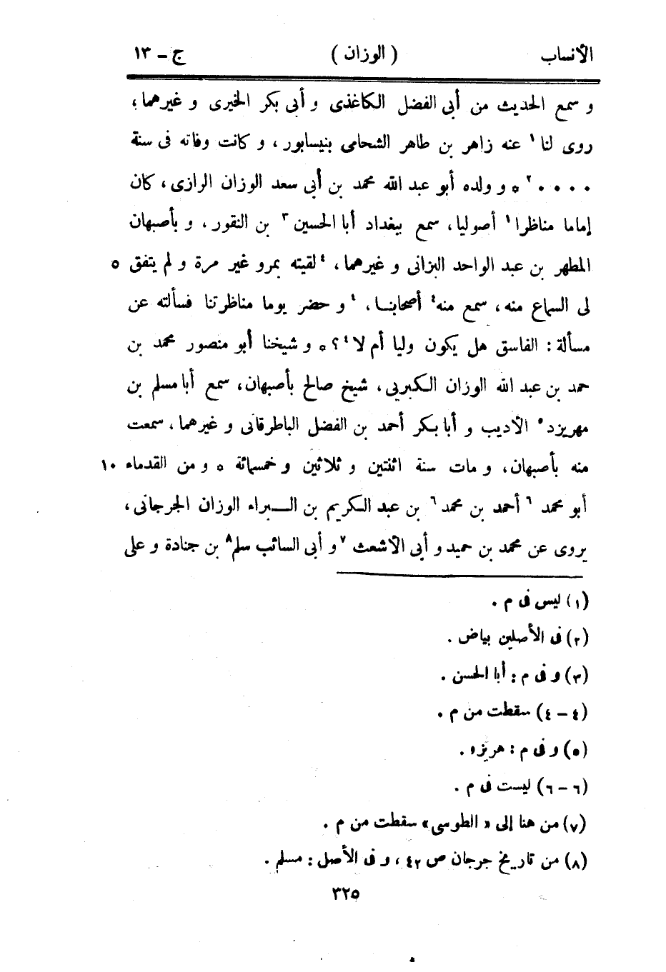 وسمع الحديث من أبى الفضل الكاغذي وأبى بكر الخيريّ وغيرهما، روى لنا [1] عنه زاهر بن طاهر الشحامي بنيسابور، وكانت وفاته في سنة ... [2] وولده أبو عبد الله محمد بن أبى سعيد الوزان الرازيّ، كان إماما مناظرا أصوليا، سمع ببغداد أبا الحسين [3] بن النقور، وبأصبهان المطهر بن عبد الواحد البزاني وغيرهما، [4] لقيته بمرو غير مرة ولم يتفق إلى السماع منه، سمع منه [4] أصحابنا، [4] وحضر يوما مناظرتنا فسألته عن مسألة: الفاسق هل يكون وليا أم لا [4] ؟ وشيخنا أبو منصور محمد بن حمد بن عبد الله الوزان الكبريى، شيخ صالح بأصبهان، سمع أبا مسلم بن مهريزد [5] الأديب وأبا بكر أحمد بن الفضل الباطرقاني وغيرهما، سمعت منه بأصبهان، ومات سنة اثنتين وثلاثين وخمسمائة ومن القدماء أبو محمد [6] أحمد بن محمد [6] بن عبد الكريم بن البراء الوزان الجرجاني، يروى عن محمد بن حميد وأبى الأشعث [7] وأبى السائب سلم [8] بن جنادة وعلى