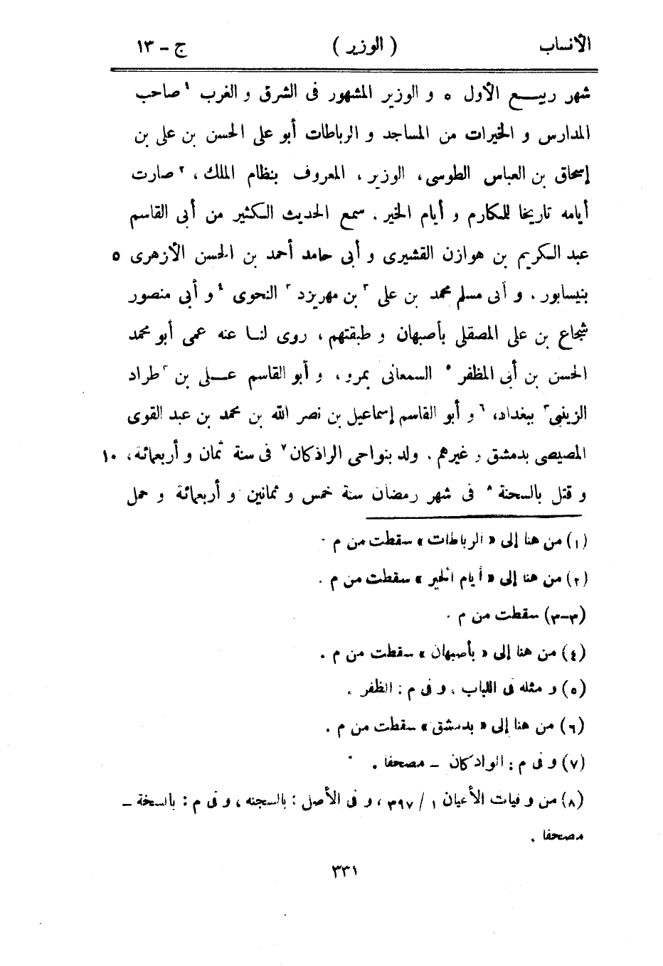 شهر ربيع الأول والوزير المشهور في الشرق والغرب [1] صاحب المدارس والخيرات من المساجد والرباطات أبو على الحسن بن على بن إسحاق بن العباس الطوسي، الوزير، المعروف بنظام الملك، [2] صارت أيامه تاريخا للمكارم وأيام الخير، سمع الحديث الكثير من أبى القاسم عبد الكريم بن هوازن القشيري وأبى حامد أحمد بن الحسن الأزهري بنيسابور، وأبى مسلم محمد بن على [3] بن مهريزد [3] النحويّ [4] وأبى منصور شجاع بن على المصقلي بأصبهان وطبقتهم، روى لنا عنه عمى أبو محمد الحسن بن أبى المظفر [5] السمعاني بمرو، وأبو القاسم على بن [3] طراد الزينبي [3] ببغداد، [6] وأبو القاسم إسماعيل بن نصر الله بن محمد بن عبد القوى المصيصي بدمشق وغيرهم، ولد بنواحي الراذكان [7] في سنة ثمان وأربعمائة، وقتل بالسحنة [8] في شهر رمضان سنة خمس وثمانين وأربعمائة وحمل