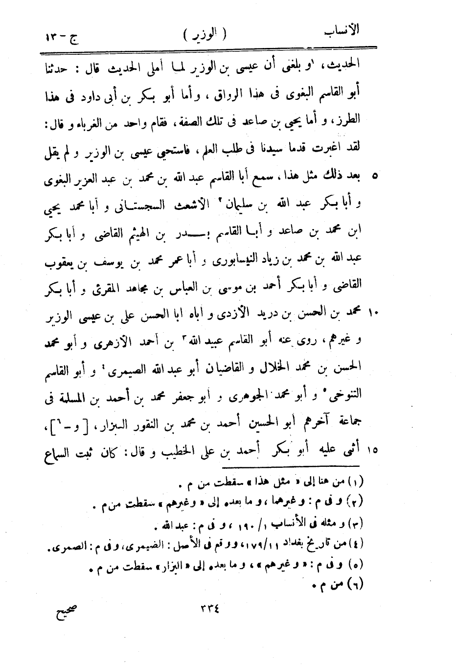 الحديث، [1] وبلغني أن عيسى بن الوزير لما أملى الحديث قال: حدثنا أبو القاسم البغوي في هذا الرواق، وأما أبو بكر بن أبى داود في هذا الطرز، وأما يحيى بن صاعد في تلك الصفة، فقام واحد من الغرباء وقال: