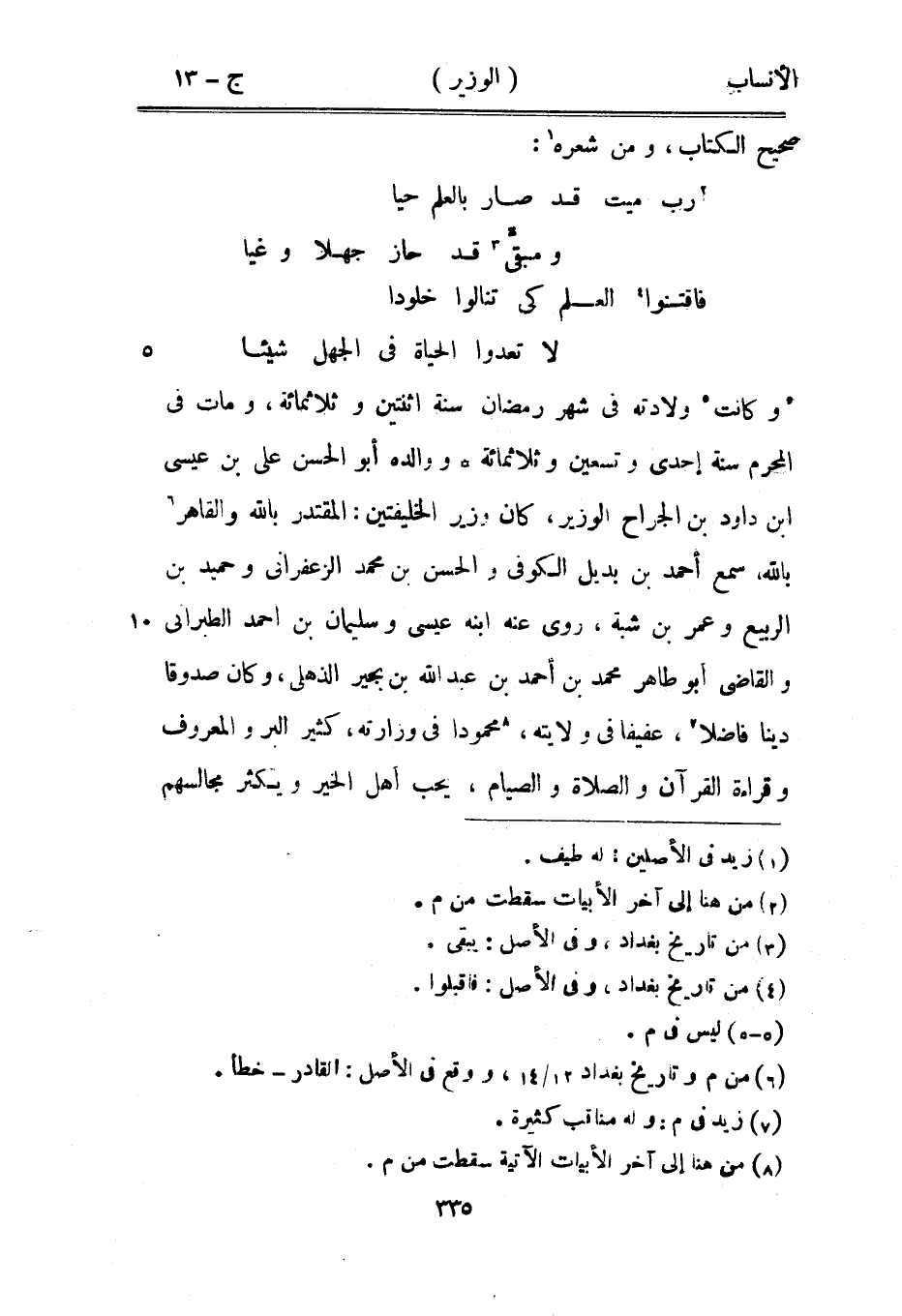 [5] وكانت [5] ولادته في شهر رمضان سنة اثنتين وثلاثمائة، ومات في المحرم سنة إحدى وتسعين وثلاثمائة ووالده أبو الحسن على بن عيسى ابن داود بن الجراح الوزير، كان وزير الخليفتين: المقتدر باللَّه والقاهر [6] باللَّه، سمع أحمد بن بديل الكوفي والحسن بن محمد الزعفرانيّ وحميد بن الربيع وعمر بن شبة، روى عنه ابنه عيسى وسليمان بن احمد الطبراني والقاضي أبو طاهر محمد بن أحمد بن عبد الله بن بجير الذهلي، وكان صدوقا دينا فاضلا [7] ، عفيفا في ولايته، [8] محمودا في وزارته، كثير البر والمعروف وقراءة القرآن والصلاة والصيام، يحب أهل الخير ويكثر مجالسهم