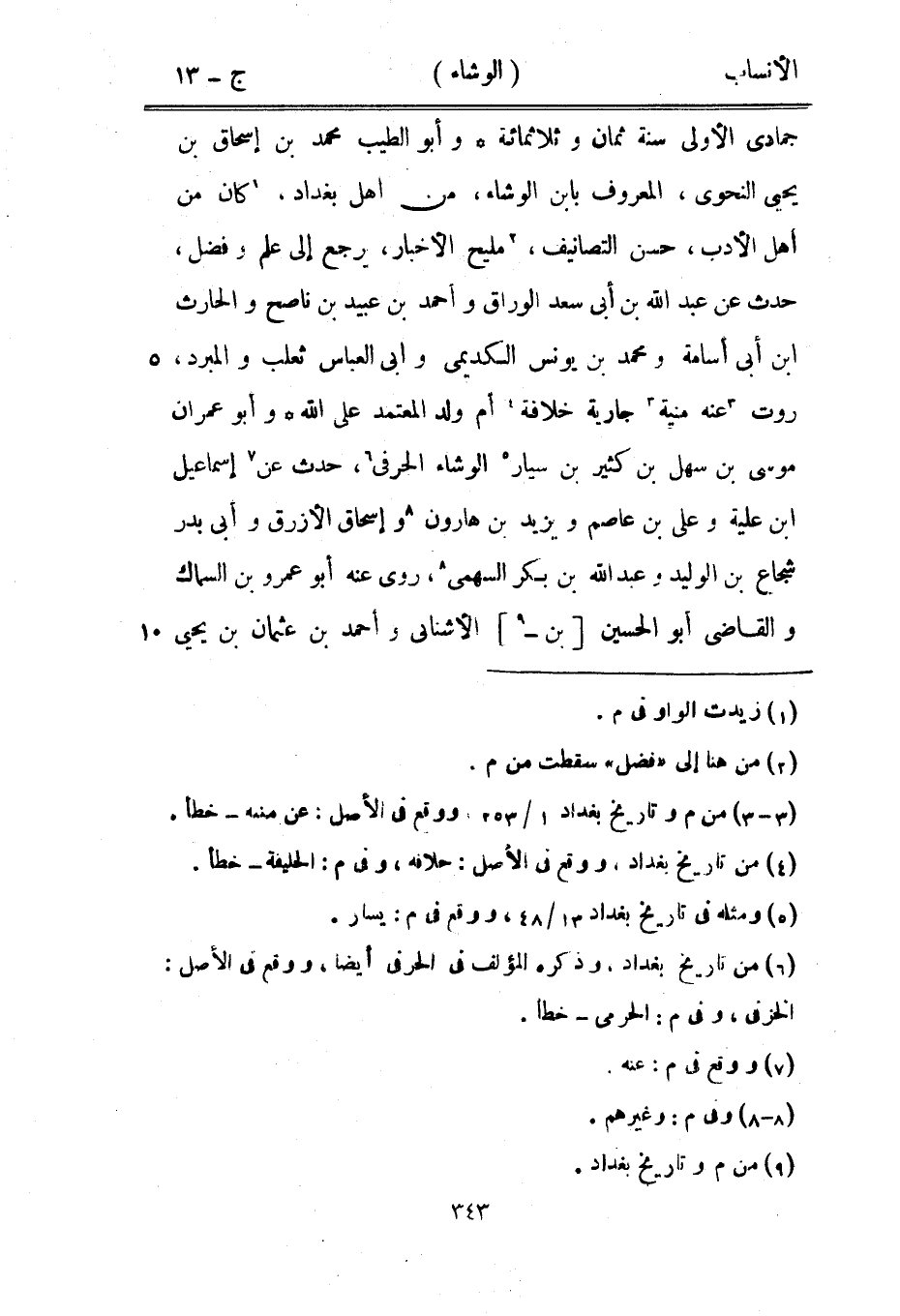 جمادى الأولى سنة ثمان وثلاثمائة وأبو الطيب محمد بن إسحاق بن يحيى النحويّ، المعروف بابن الوشاء، من أهل بغداد، [1] كان من أهل الأدب، حسن التصانيف، [2] مليح الأخبار، يرجع إلى علم وفضل، حدث عن عبد الله بن أبى سعد الوراق وأحمد بن عبيد بن ناصح والحارث ابن أبى أسامة ومحمد بن يونس الكديمي وأبى العباس ثعلب والمبرد، روت [3] عنه منية [3] جارية خلافة [4] أم ولد المعتمد على الله وأبو عمران موسى بن سهل بن كثير بن سيار [5] الوشاء الحرفى [6] ، حدث عن [7] إسماعيل ابن علية وعلى بن عاصم ويزيد بن هارون [8] وإسحاق الأزرق وأبى بدر شجاع بن الوليد وعبد الله بن بكر السهمي [8] ، روى عنه أبو عمرو بن السماك والقاضي أبو الحسين [بن-[9]] الأشنائى وأحمد بن عثمان بن يحيى