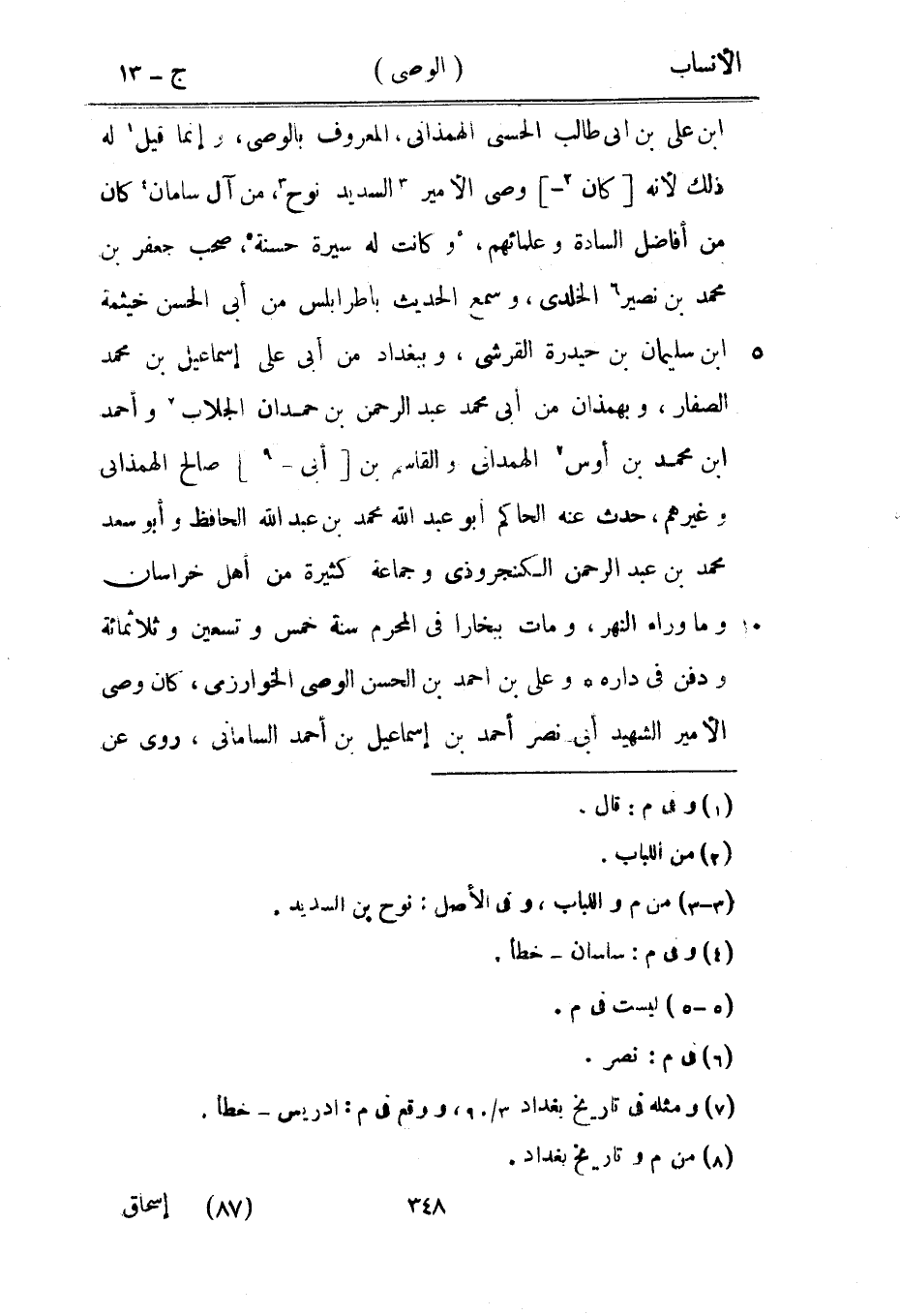 ابن على بن ابى طالب الحسنى الهمذانيّ، المعروف بالوصي، وإنما قيل [1] له ذلك لأنه [كان [2]-] وصى الأمير [3] السديد نوح [3] ، من آل سامان [4] كان من أفاضل السادة وعلمائهم، [5] وكانت له سيرة حسنة [5] ، صحب جعفر بن محمد بن نصير [6] الخلدى، وسمع الحديث باطرابلس من أبى الحسن خيثمة ابن سليمان بن حيدرة القرشي، وببغداد من أبى على إسماعيل بن محمد الصفار، وبهمذان من أبى محمد عبد الرحمن بن حمدان الجلاب [7] وأحمد ابن محمد بن أوس [7] الهمدانيّ والقاسم بن [أبى-[8]] صالح الهمذانيّ وغيرهم، حدث عنه الحاكم أبو عبد الله محمد بن عبد الله الحافظ وأبو سعد محمد بن عبد الرحمن الكنجروذي وجماعة كثيرة من أهل خراسان وما وراء النهر، ومات ببخارا في المحرم سنة خمس وتسعين وثلاثمائة ودفن في داره وعلى بن احمد بن الحسن الوصي الخوارزمي، كان وصى الأمير الشهيد أبى نصر أحمد بن إسماعيل بن أحمد الساماني، روى عن