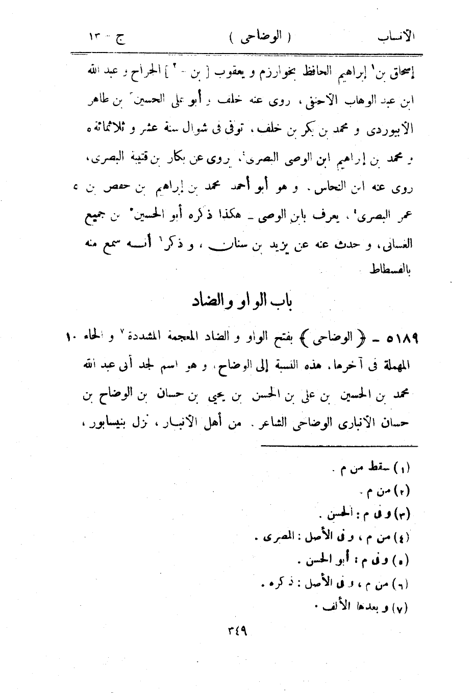 بفتح الواو والضاد المعجمة المشددة [7] والحاء المهملة في آخرها، هذه النسبة إلى الوضاح، وهو اسم لجد أبى عبد الله محمد بن الحسين بن على بن الحسن بن يحيى بن حسان بن الوضاح بن حسان الأنباري الوضاحى الشاعر. من أهل الأنبار، نزل بنيسابور،