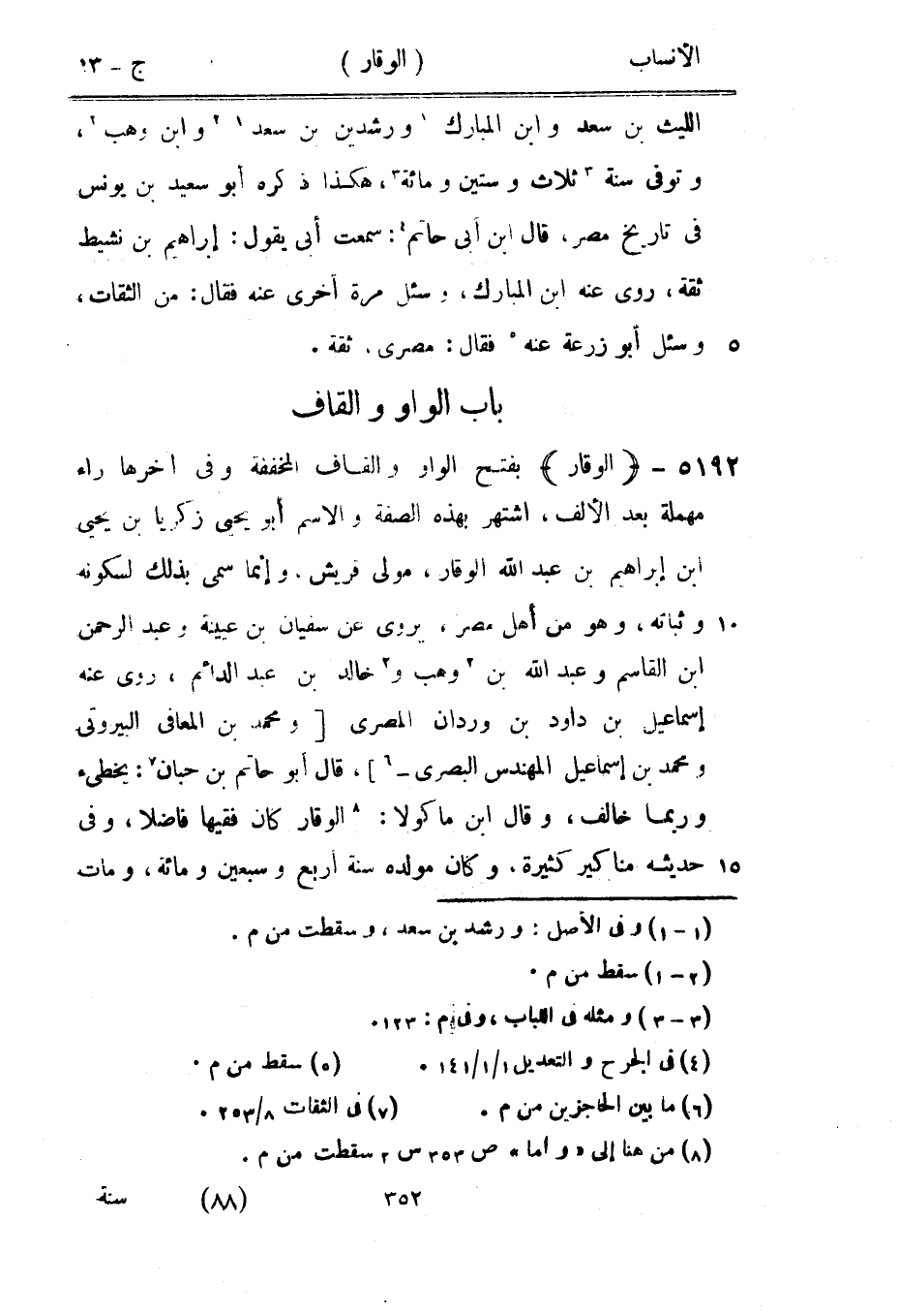 بفتح الواو والقاف المخففة وفي آخرها راء مهملة بعد الألف، اشتهر بهذه الصفة والاسم أبو يحيى زكريا بن يحيى ابن إبراهيم بن عبد الله الوقار، مولى قريش، وإنما سمى بذلك لسكونه وثباته، وهو من أهل مصر، يروى عن سفيان بن عيينة وعبد الرحمن ابن القاسم وعبد الله بن [2] وهب و [2] خالد بن عبد الدائم، روى عنه إسماعيل بن داود بن وردان المصري [ومحمد بن المعافى البيروتي ومحمد بن إسماعيل المهندس البصري-[6]] ، قال أبو حاتم بن حبان [7] : يخطئ وربما خالف، وقال ابن ماكولا: [8] الوقار كان فقيها فاضلا، وفي حديثه مناكير كثيرة، وكان مولده سنة أربع وسبعين ومائة، ومات