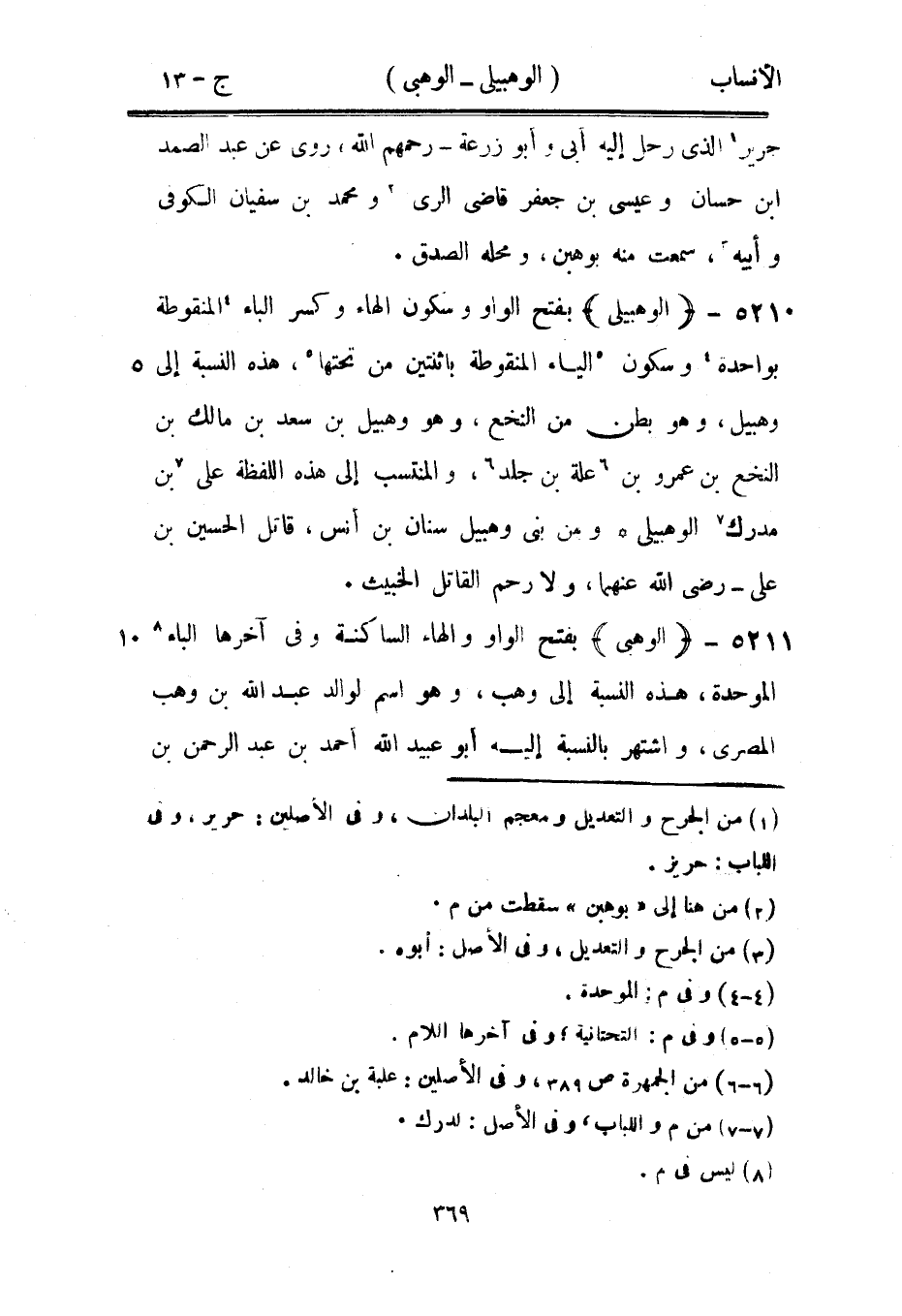 بفتح الواو والهاء الساكنة وفي آخرها الباء [8] الموحدة، هذه النسبة إلى وهب، وهو اسم لوالد عبد الله بن وهب المصري، واشتهر بالنسبة إليه أبو عبيد الله أحمد بن عبد الرحمن بن