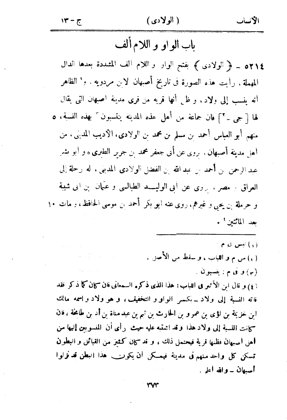 [4] وقال ابن الأثير في اللباب: هذا الّذي ذكره السمعاني فان كان كما ذكر فقد فاته النسبة إلى ولاد- بكسر الواو والتخفيف، وهو ولاد واسمه مالك ابن خزيمة بن لؤيّ بن عمرو بن الحارث بن تيم بن عبد مناة بن أد بن طابخة، فان كانت النسبة إلى ولاد هذا وقد اشتبه عليه حيث رأى أن المنسوبين إليها من أهل أصبهان فظنها قرية فيحتمل ذلك، وقد كان كثير من القبائل والبطون تسكن كل واحد منهم في مدينة فيمكن أن يكون هذا البطن قد نزلوا أصبهان- والله أعلم.