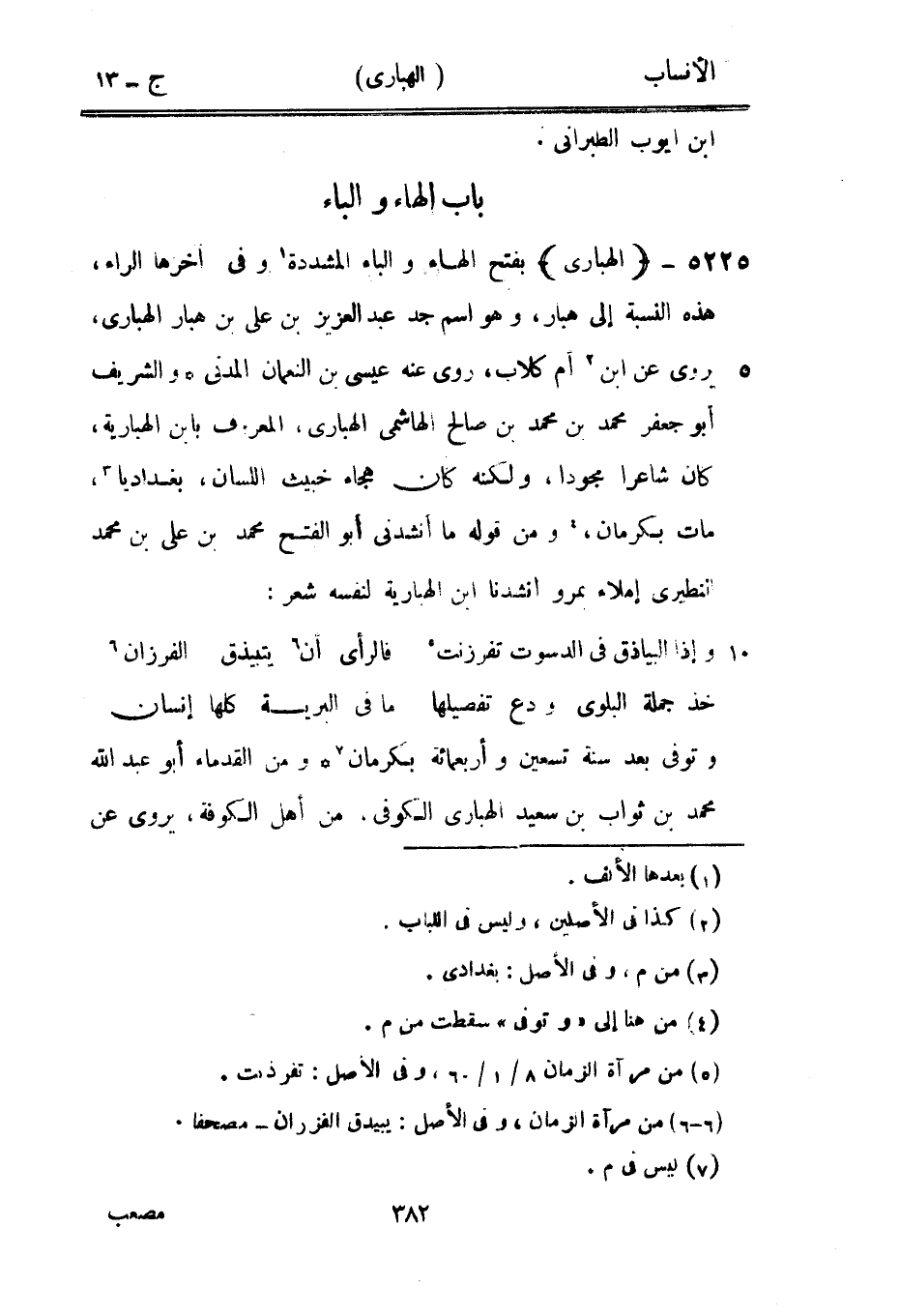بفتح الهاء والباء المشددة [1] وفي آخرها الراء، هذه النسبة إلى هبار، وهو اسم جد عبد العزيز بن على بن هبار الهبارى، يروى عن ابن [2] أم كلاب، روى عنه عيسى بن النعمان المدني والشريف أبو جعفر محمد بن محمد بن صالح الهاشمي الهبارى، المعروف بابن الهبارية، كان شاعرا مجودا، ولكنه كان هجاء خبيث اللسان، بغداديا [3] ، مات بكرمان، [4] ومن قوله ما أنشدنى أبو الفتح محمد بن على بن محمد النطيرى إملاء بمرو أنشدنا ابن الهبارية لنفسه شعر:
