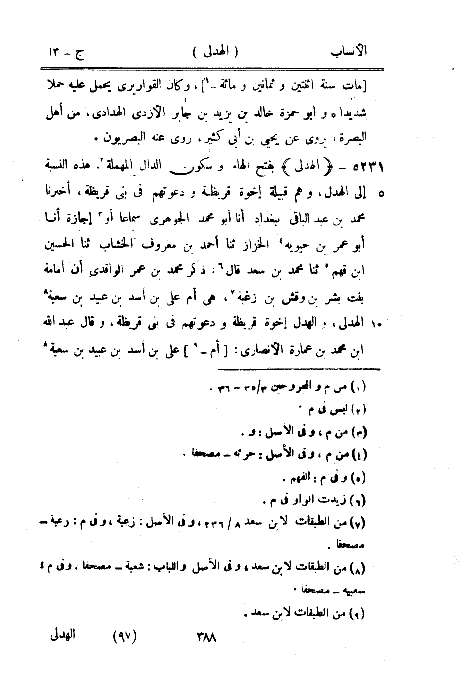 بفتح الهاء وسكون الدال المهملة [2] ، هذه النسبة إلى الهدل، وهم قبيلة إخوة قريظة ودعوتهم في بنى قريظة، أخبرنا محمد بن عبد الباقي ببغداد أنا أبو محمد الجوهري سماعا أو [3] إجازة أنا أبو عمر بن حيويه [4] الخزاز ثنا أحمد بن معروف الخشاب ثنا الحسين ابن قهم [5] ثنا محمد بن سعد قال [6] : ذكر محمد بن عمر الواقدي أن أمامة بنت بشر بن وقش بن زغبة [7] ، هي أم على بن أسد بن عبيد بن سعية [8] الهدلى، والهدل إخوة قريظة ودعوتهم في بنى قريظة، وقال عبد الله ابن محمد بن عمارة الأنصاري: [أم-[9]] على بن أسد بن عبيد بن سعية [8]