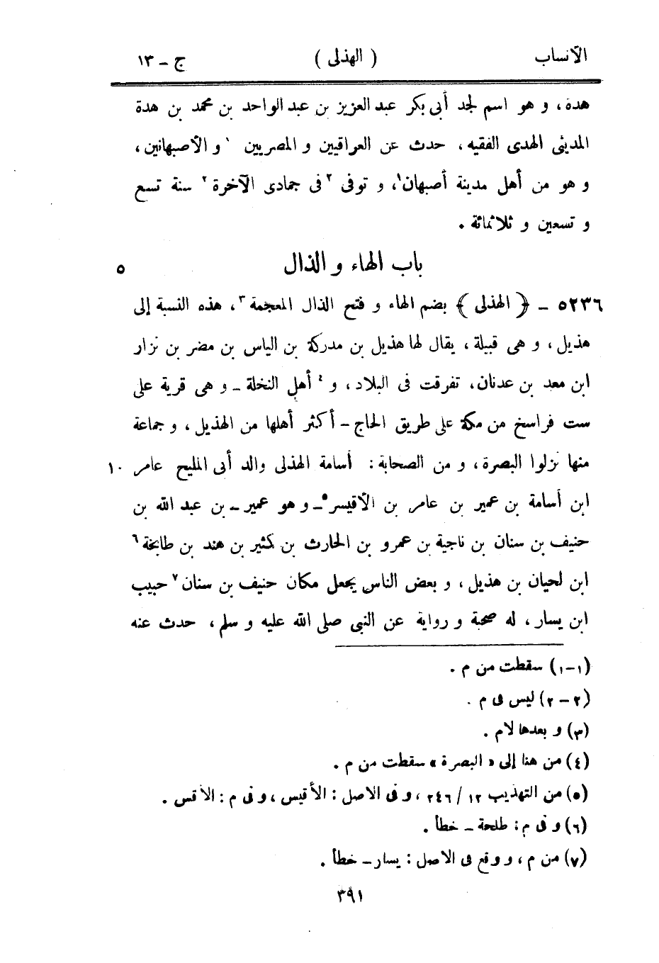 بضم الهاء وفتح الذال المعجمة [3] ، هذه النسبة إلى هذيل، وهي قبيلة، يقال لها هذيل بن مدركة بن الياس بن مضر بن نزار ابن معد بن عدنان، تفرقت في البلاد، و [4] أهل النخلة- وهي قرية على ست فراسخ من مكة على طريق الحاج- أكثر أهلها من الهذيل، وجماعة منها نزلوا البصرة، ومن الصحابة: أسامة الهذلي والد أبى المليح عامر ابن أسامة بن عمير بن عامر بن الأقيسر [5]- وهو عمير- بن عبد الله بن حنيف بن سنان بن ناجية بن عمرو بن الحارث بن كثير بن هند بن طابخة [6] ابن لحيان بن هذيل، وبعض الناس يجعل مكان حنيف بن سنان [7] حبيب ابن يسار، له صحبة ورواية عن النبي صلى الله عليه وسلم، حدث عنه