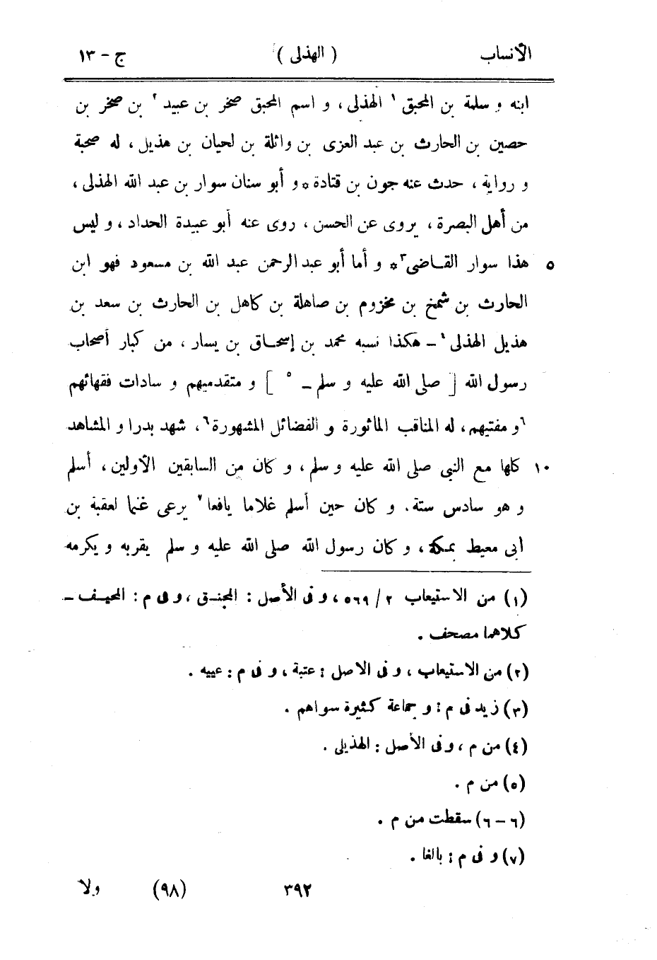 ابنه وسلمة بن المحبق [1] الهذلي، واسم المحبق صخر بن عبيد [2] بن صخر بن حصين بن الحارث بن عبد العزى بن وائلة بن لحيان بن هذيل، له صحبة ورواية، حدث عنه جون بن قتادة وأبو سنان سوار بن عبد الله الهذلي، من أهل البصرة، يروى عن الحسن، روى عنه أبو عبيدة الحداد، وليس هذا سوار القاضي [3] وأما أبو عبد الرحمن عبد الله بن مسعود فهو ابن الحارث بن شمخ بن مخزوم بن صاهلة بن كاهل بن الحارث بن سعد بن هذيل الهذلي [4]- هكذا نسبه محمد بن إسحاق بن يسار، من كبار أصحاب رسول الله [صلى الله عليه وسلم-[5]] ومتقدميهم وسادات فقهائهم [6] ومفتيهم، له المناقب الماثورة والفضائل المشهورة [6] ، شهد بدرا والمشاهد كلها مع النبي صلى الله عليه وسلم، وكان من السابقين الأولين، أسلم وهو سادس ستة، وكان حين أسلم غلاما يافعا [7] يرعى غنما لعقبة بن أبى معيط بمكة، وكان رسول الله صلى الله عليه وسلم يقربه ويكرمه
