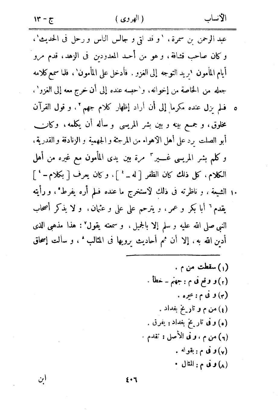 عبد الرحمن بن سمرة، [1] وقد لقي وجالس الناس ورحل في الحديث [1] ، وكان صاحب قشافة، وهو من أحد المعدودين في الزهد، قدم مرو أيام المأمون [1] يريد التوجه إلى الغزو، فأدخل على المأمون [1] ، فلما سمع كلامه جعله من الخاصة من إخوانه، و [1] حبسه عنده إلى أن خرج معه إلى الغزو [1] ، فلم يزل عنده مكرما إلى أن أراد إظهار كلام جهم [2] ، وقول القرآن مخلوق، وجمع بينه وبين بشر المريسي وسأله أن يكلمه، وكان أبو الصلت يرد على أهل الأهواء من المرجئة والجهمية والزنادقة والقدرية، وكلم بشر المريسي غير [3] مرة بين يدي المأمون مع غيره من أهل الكلام، كل ذلك كان الظفر [له-[4]] ، وكان يعرف [بكلام-[4]] الشيعة، وناظرته في ذلك لأستخرج ما عنده فلم أره يفرط [5] ، ورأيته يقدم [6] أبا بكر وعمر، ويترحم على على وعثمان، ولا يذكر أصحاب النبي صلى الله عليه وسلم إلا بالجميل، وسمعته يقول [7] : هذا مذهبي الّذي أدين الله به، إلا أن ثم أحاديث يرويها في المثالب [8] ، وسألت إسحاق