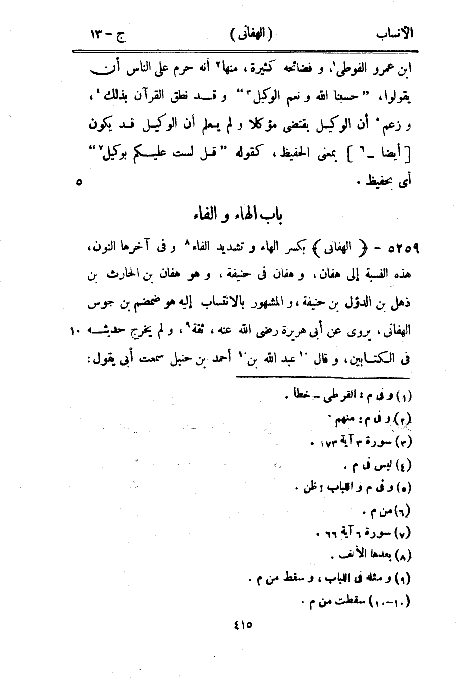 بكسر الهاء وتشديد الفاء [8] وفي آخرها النون، هذه النسبة إلى هفان، وهفان في حنيفة، وهو هفان بن الحارث بن ذهل بن الدؤل بن حنيفة، والمشهور بالانتساب إليه هو ضمضم بن جوس الهفانى، يروى عن أبى هريرة رضى الله عنه، ثقة [9] ، ولم يخرج حديثه في الكتابين، وقال [10] عبد الله بن [10] أحمد بن حنبل سمعت أبى يقول: