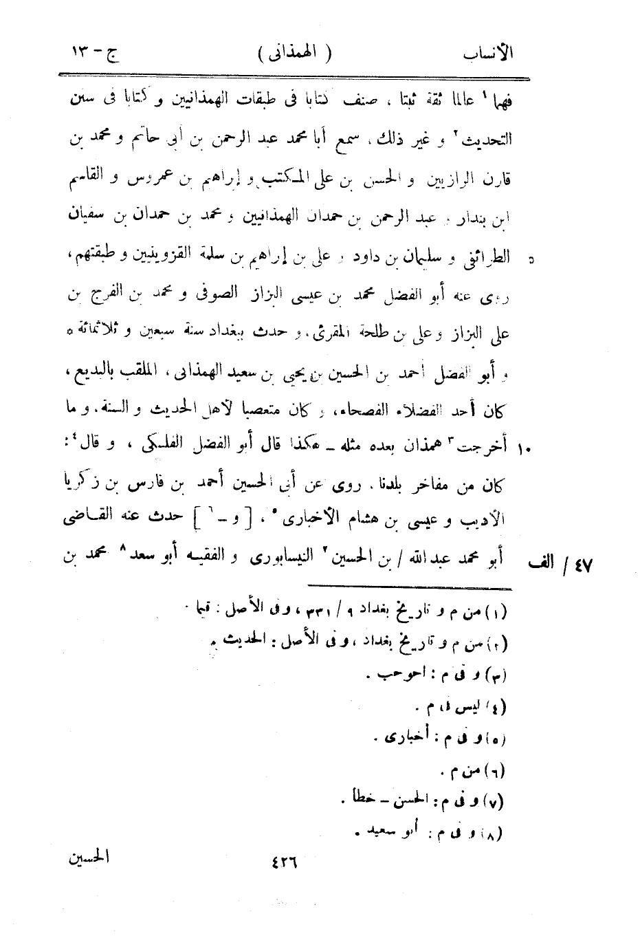 فهما [1] عالما ثقة ثبتا، صنف كتابا في طبقات الهمذانيين وكتابا في سنن التحديث [2] وغير ذلك، سمع أبا محمد عبد الرحمن بن أبى حاتم ومحمد بن قارن الرازيين والحسن بن على المكتب وإبراهيم بن عمروس والقاسم ابن بندار وعبد الرحمن بن حمدان الهمذانيين ومحمد بن حمدان بن سفيان الطرائفى وسليمان بن داود وعلى بن إبراهيم بن سلمة القزوينيين وطبقتهم، روى عنه أبو الفضل محمد بن عيسى البزاز الصوفي ومحمد بن الفرج بن على البزاز وعلى بن طلحة المقرئ، وحدث ببغداد سنة سبعين وثلاثمائة وأبو الفضل أحمد بن الحسين بن يحيى بن سعيد الهمذانيّ، الملقب بالبديع، كان أحد الفضلاء الفصحاء، وكان متعصبا لأهل الحديث والسنة، وما أخرجت [3] همذان بعده مثله- هكذا قال أبو الفضل الفلكي، وقال [4] :