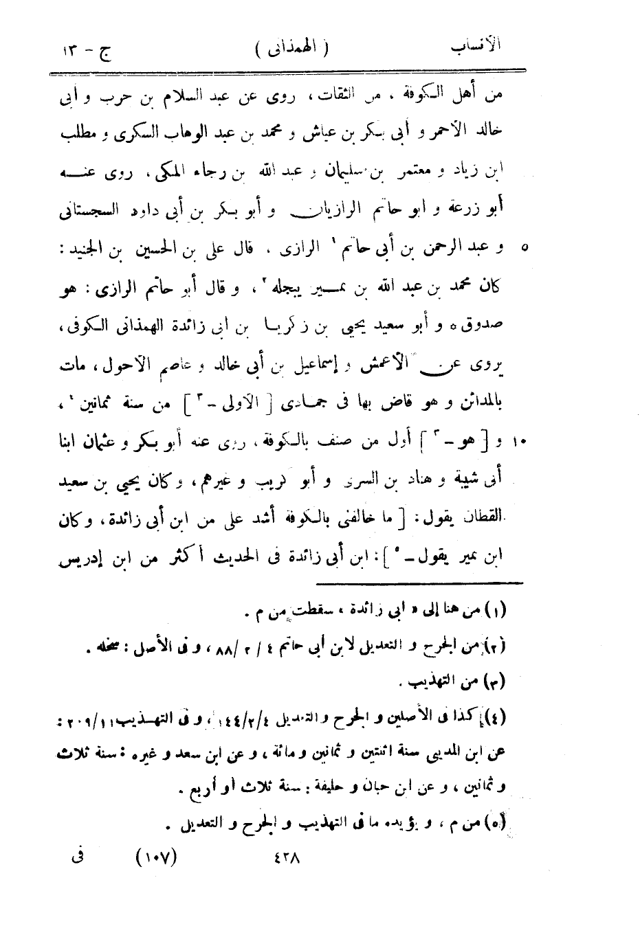 كان محمد بن عبد الله بن نمير يبجله [2] ، وقال أبو حاتم الرازيّ: هو صدوق وأبو سعيد يحيى بن زكريا بن أبى زائدة الهمذانيّ الكوفي، يروى عن الأعمش وإسماعيل بن أبى خالد وعاصم الأحول، مات بالمدائن وهو قاض بها في جمادى [الأولى-[3]] من سنة ثمانين [4] ، و [هو-[3]] أول من صنف بالكوفة، روى عنه أبو بكر وعثمان ابنا أبى شيبة وهناد بن السري وأبو كريب وغيرهم، وكان يحيى بن سعيد القطان يقول: [ما خالفني بالكوفة أشد على من ابن أبى زائدة، وكان ابن نمير يقول-[5]] : ابن أبى زائدة في الحديث أكثر من ابن إدريس