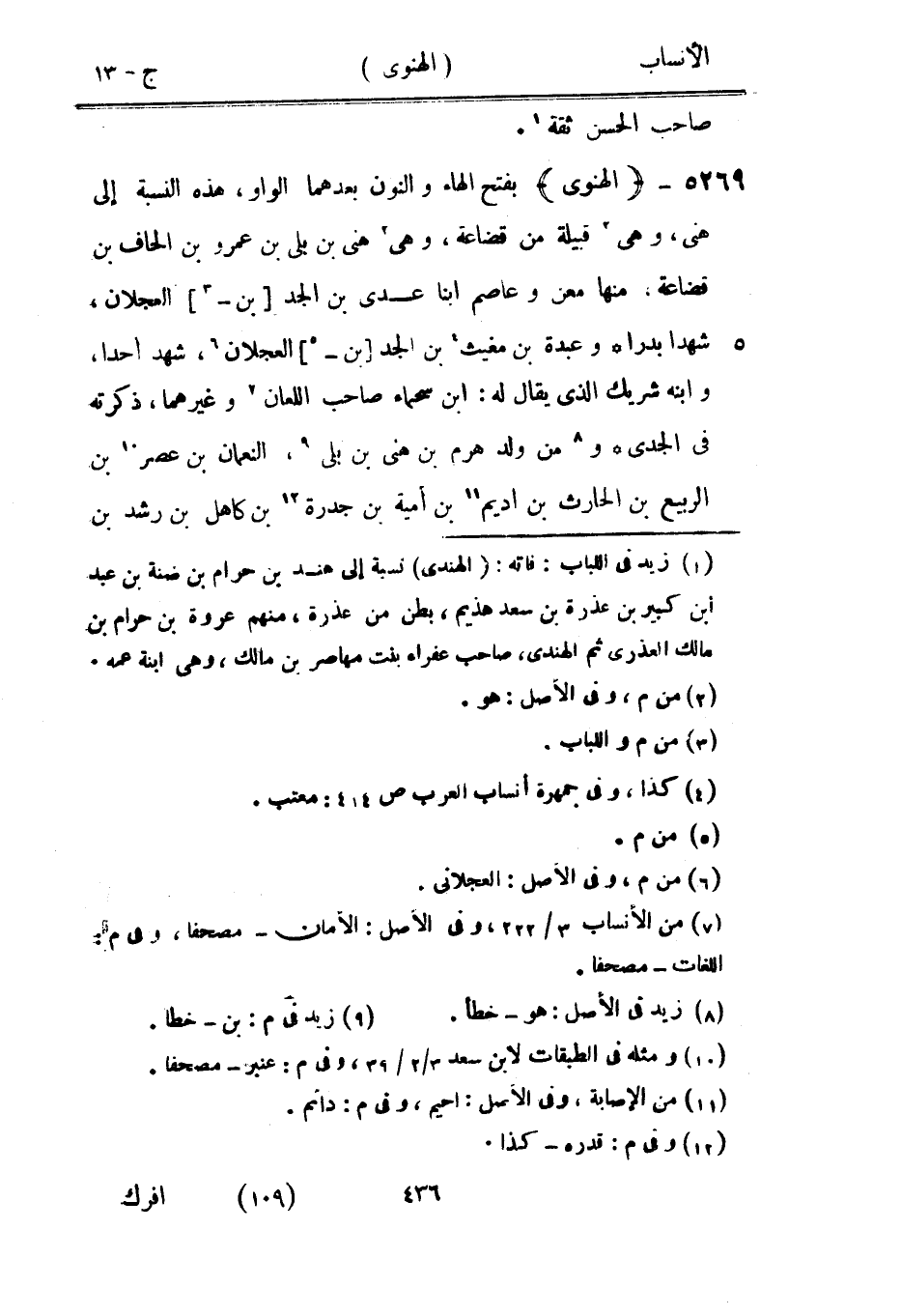 بفتح الهاء والنون بعدهما الواو، هذه النسبة إلى هني، وهي [2] قبيلة من قضاعة، وهي [2] هني بن بلى بن عمرو بن الحاف بن قضاعة، منها معن وعاصم ابنا عدي بن الجد [بن-[3]] العجلان، شهدا بدرا وعبدة بن مغيث [4] بن الجد [بن-[5]] العجلان [6] ، شهد أحدا، وابنه شريك الّذي يقال له: ابن سحماء صاحب اللعان [7] وغيرهما، ذكرته في الجدي و [8] من ولد هرم بن هني بن بلى [9] ، النعمان بن عصر [10] بن الربيع بن الحارث بن اديم [11] بن أمية بن جدرة [12] بن كاهل بن رشد بن