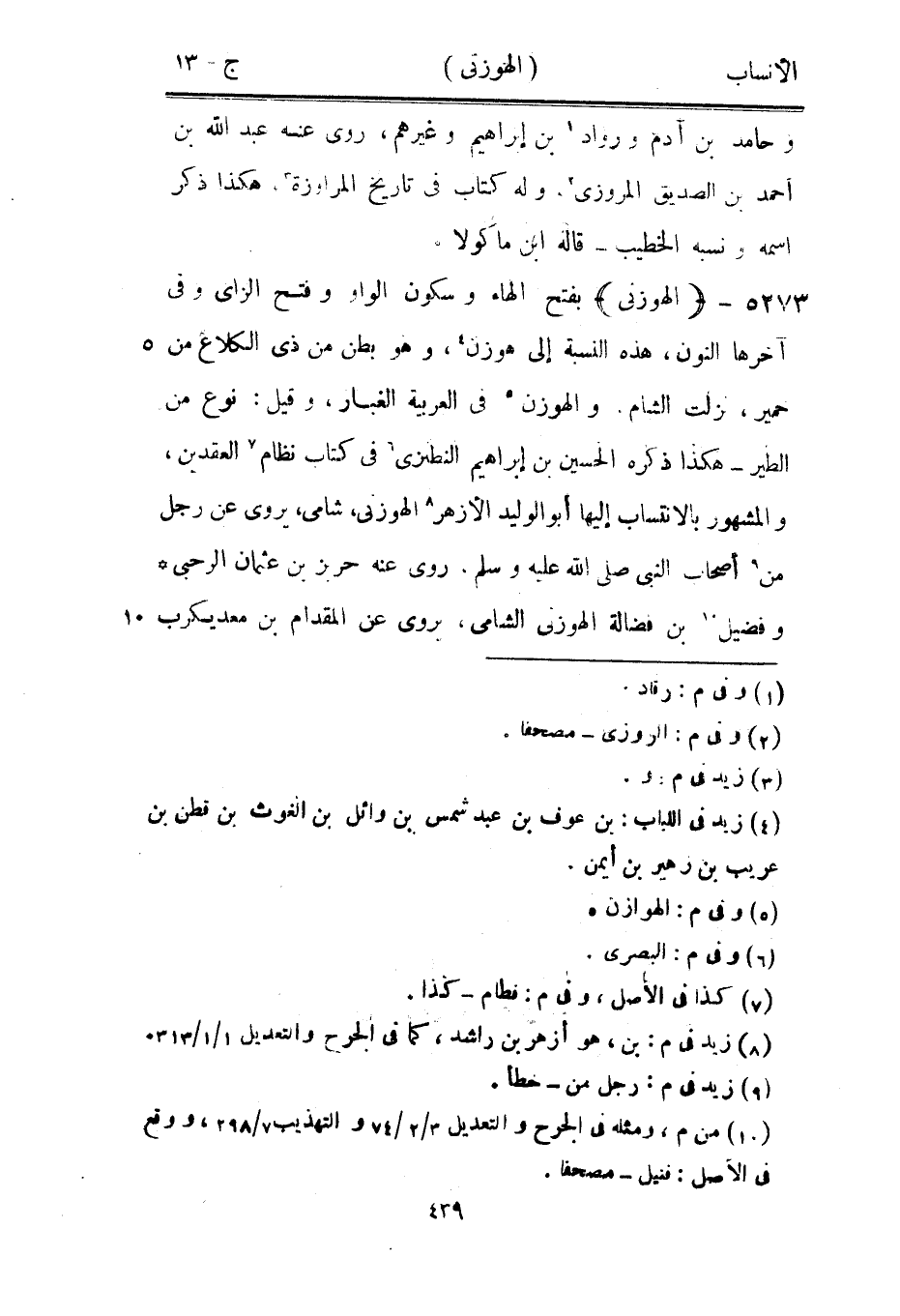 بفتح الهاء وسكون الواو وفتح الزاى وفي آخرها النون، هذه النسبة إلى هوزن [4] ، وهو بطن من ذي الكلاع من حمير، نزلت الشام، والهوزن [5] في العربية الغبار، وقيل: نوع من الطير- هكذا ذكره الحسين بن إبراهيم النطنزي [6] في كتاب نظام [7] العقدين، والمشهور بالانتساب إليها أبو الوليد الأزهر [8] الهوزني، شامي، يروى عن رجل من [9] أصحاب النبي صلى الله عليه وسلم، روى عنه حريز بن عثمان الرحبيّ وفضيل [10] بن فضالة الهوزني الشامي، يروى عن المقدام بن معديكرب