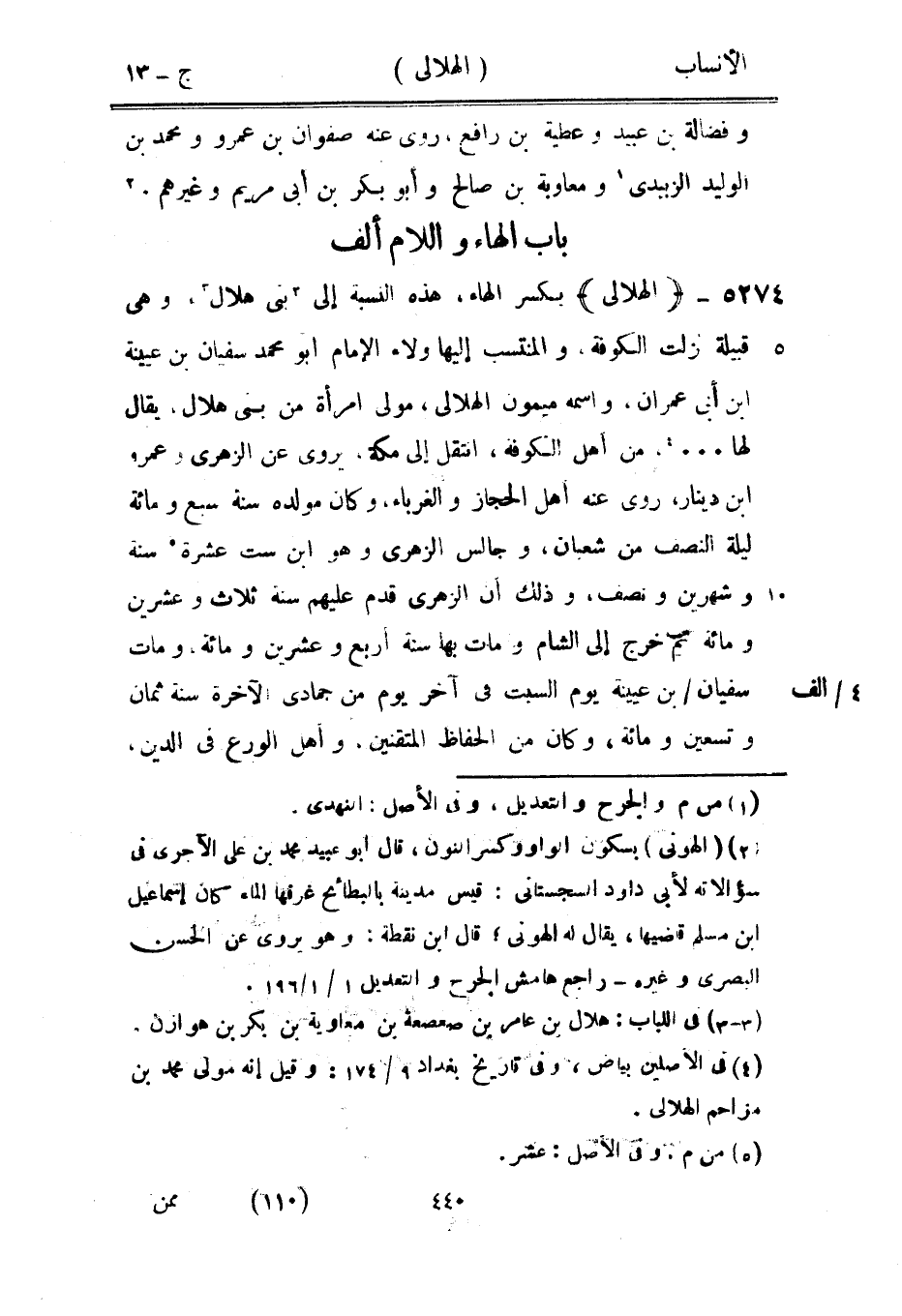 بكسر الهاء، هذه النسبة إلى [3] بنى هلال [3] ، وهي قبيلة نزلت الكوفة، والمنتسب إليها ولاء الإمام أبو محمد سفيان بن عيينة ابن أبى عمران، واسمه ميمون الهلالي، مولى امرأة من بنى هلال، يقال لها ... [4] ، من أهل الكوفة، انتقل إلى مكة، يروى عن الزهري وعمر، ابن دينار، روى عنه أهل الحجاز والغرباء، وكان مولده سنة سبع ومائة ليلة النصف من شعبان، وجالس الزهري وهو ابن ست عشرة [5] سنة وشهرين ونصف، وذلك أن الزهري قدم عليهم سنة ثلاث وعشرين ومائة ثم خرج إلى الشام ومات بها سنة أربع وعشرين ومائة، ومات سفيان/ بن عيينة يوم السبت في آخر يوم من جمادى الآخرة سنة ثمان وتسعين ومائة، وكان من الحفاظ المتقنين، وأهل الورع في الدين،