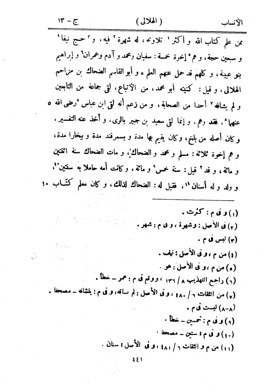 ممن علم كتاب الله وأكثر [1] تلاوته، له شهرة [2] فيه، و [3] حج نيفا [4] وسبعين حجة، وهم [5] إخوة خمسة: سفيان ومحمد وآدم وعمران [6] وإبراهيم بنو عيينة، وكلهم قد حمل عنهم العلم وأبو القاسم الضحاك بن مزاحم الهلالي، وقيل: كنيته أبو محمد، من الأتباع، لقي جماعة من التابعين ولم يشافه [7] أحدا من الصحابة، ومن زعم أنه لقي ابن عباس [8] رضى الله عنهما [8] ، فقد وهم، وإنما لقي سعيد بن جبير بالري، وأخذ عنه التفسير، وكان أصله من بلخ، وكان يقيم بها مدة وبسمرقند مدة وببخارا مدة، وهم إخوة ثلاثة: مسلم ومحمد والضحاك، ومات الضحاك سنة اثنتين ومائة، وقد [2] قيل: سنة خمس [9] ومائة، وكانت أمه حاملا به سنتين [10] ، وولد وله أسنان [11] ، فقيل له: الضحاك لذلك، وكان معلم كتاب