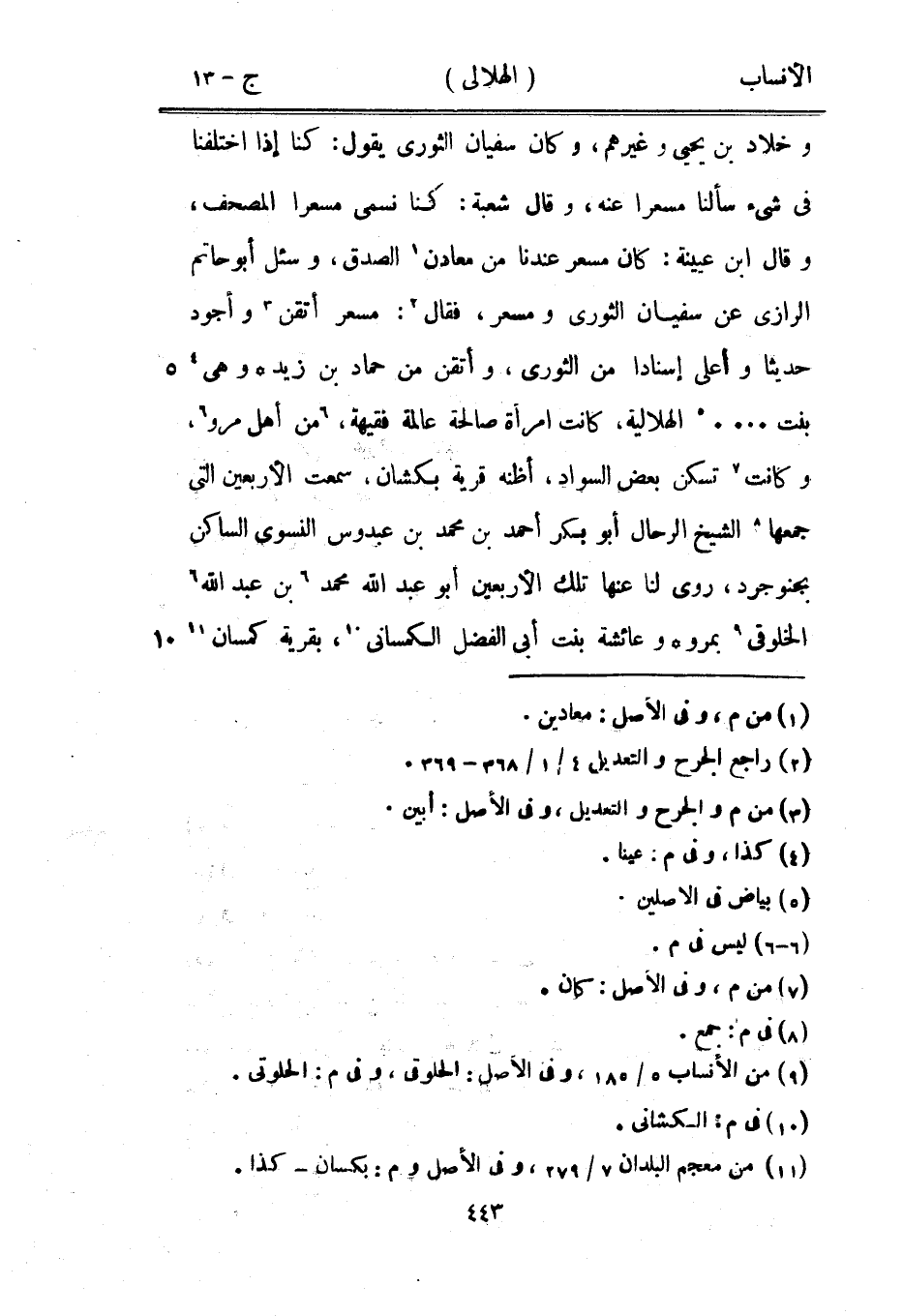 وخلاد بن يحيى وغيرهم، وكان سفيان الثوري يقول: كنا إذا اختلفنا في شيء سألنا مسعرا عنه، وقال شعبة: كنا نسمي مسعرا المصحف، وقال ابن عيينة: كان مسعر عندنا من معادن [1] الصدق، وسئل أبو حاتم الرازيّ عن سفيان الثوري ومسعر، فقال [2] : مسعر أتقن [3] وأجود حديثا وأعلى إسنادا من الثوري، وأتقن من حماد بن زيد وهي [4] بنت.... [5] الهلالية، كانت امرأة صالحة عالمة فقيهة، [6] من أهل مرو [6] ، وكانت [7] تسكن بعض السواد، أظنه قرية بكشان، سمعت الأربعين التي جمعها [8] الشيخ الرحال أبو بكر أحمد بن محمد بن عبدوس النسوي الساكن بجنوجرد، روى لنا عنها تلك الأربعين أبو عبد الله محمد [6] بن عبد الله [6] الخلوقى [9] بمرو وعائشة بنت أبى الفضل الكمسانى [10] ، بقرية كمسان [11]