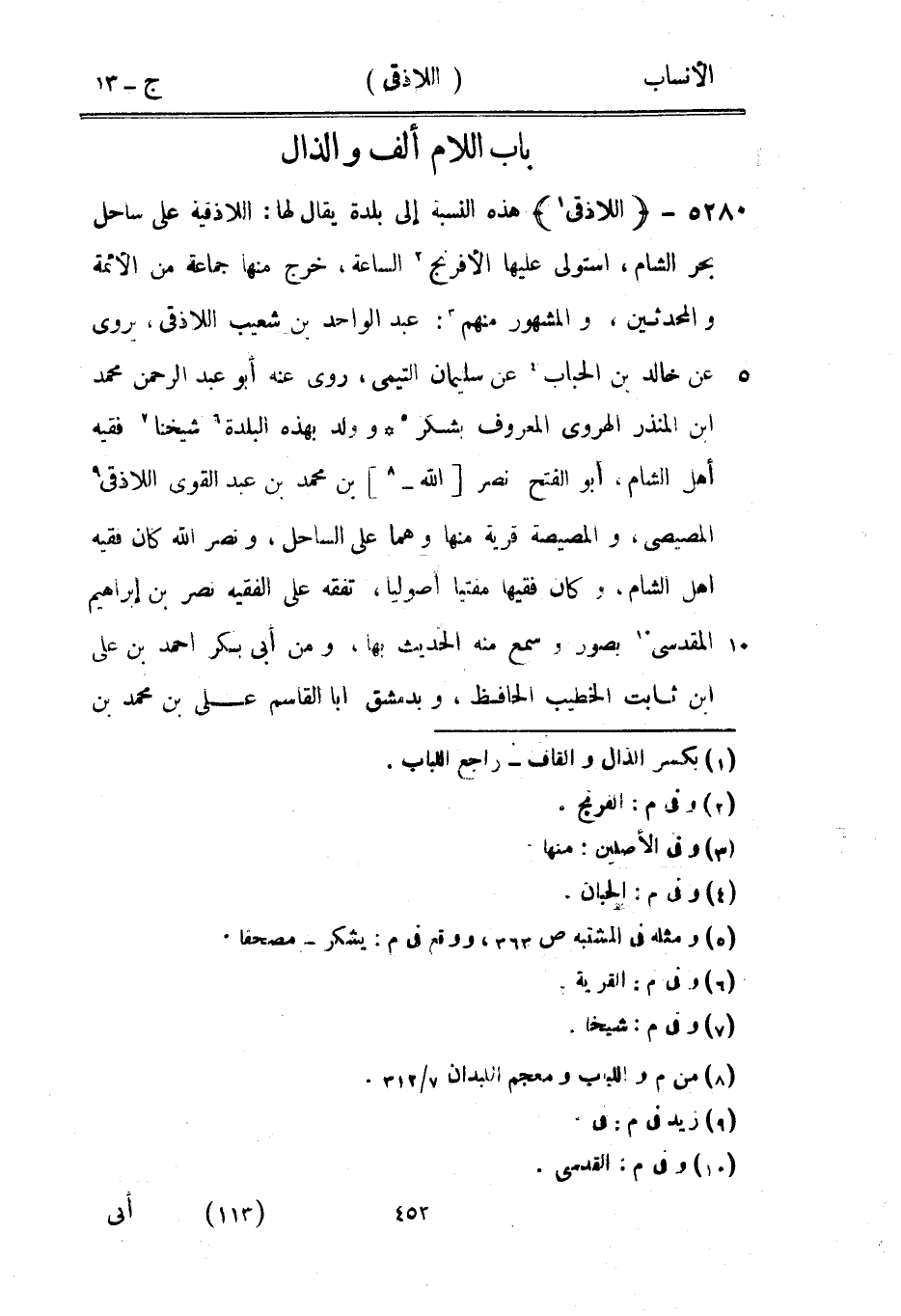 هذه النسبة إلى بلدة يقال لها: اللاذقية على ساحل بحر الشام، استولى عليها الأفرنج [2] الساعة، خرج منها جماعة من الأئمة والمحدثين، والمشهور منهم [3] : عبد الواحد بن شعيب اللاذقي، يروى عن خالد بن الحباب [4] عن سليمان التيمي، روى عنه أبو عبد الرحمن محمد ابن المنذر الهروي المعروف بشكر [5] وولد بهذه البلدة [6] شيخنا [7] فقيه أهل الشام، أبو الفتح نصر [الله-[8]] بن محمد بن عبد القوى اللاذقي [9] المصيصي، والمصيصة قرية منها وهما على الساحل، ونصر الله كان فقيه أهل الشام، وكان فقيها مفتيا أصوليا، تفقه على الفقيه نصر بن إبراهيم المقدسي [10] بصور وسمع منه الحديث بها، ومن أبى بكر احمد بن على ابن ثابت الخطيب الحافظ، وبدمشق ابا القاسم على بن محمد بن