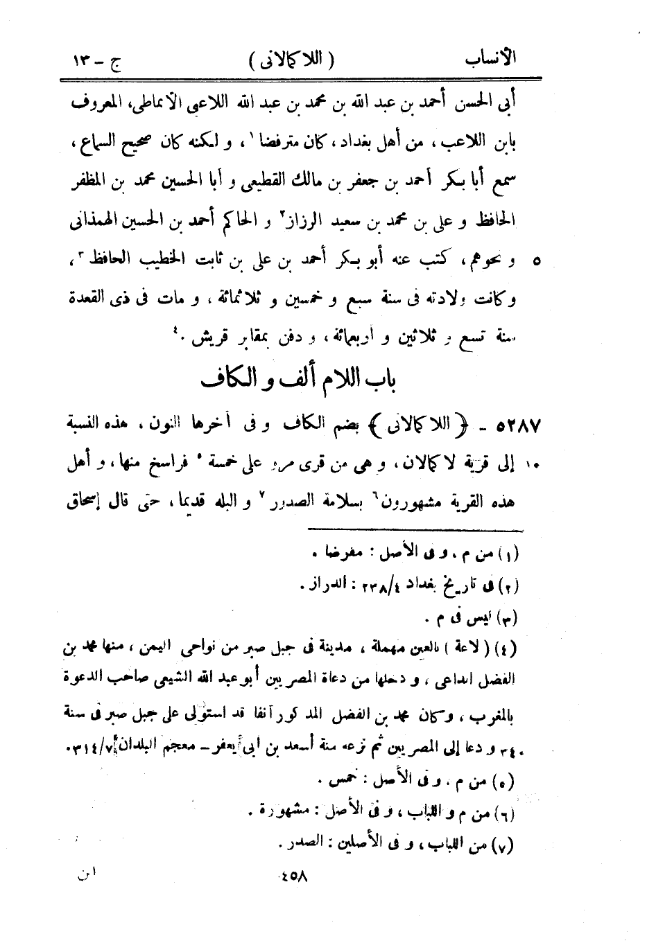 بضم الكاف وفي آخرها النون، هذه النسبة إلى قرية لاكمالان، وهي من قرى مرو على خمسة [5] فراسخ منها، وأهل هذه القرية مشهورون [6] بسلامة الصدور [7] والليلة قديما، حتى قال إسحاق