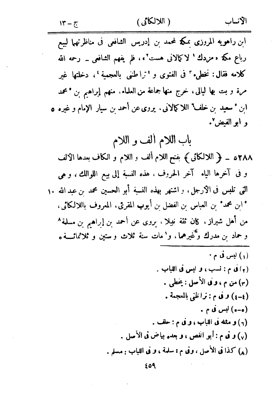 بفتح اللام ألف واللام والكاف بعدها الألف وفي آخرها الياء آخر الحروف، هذه النسبة إلى بيع اللوالك، وهي التي تلبس في الأرجل، واشتهر بهذه النسبة أبو الحسين محمد بن عبد الله [5] ابن محمد [5] بن العباس بن الفضل بن أيوب المقرئ، المعروف باللالكائى، من أهل شيراز، كان ثقة نبيلا، يروى عن أحمد بن إبراهيم بن مسلمة [8] وحماد بن مدرك وغيرهما، و [1] مات سنة ثلاث وستين وثلاثمائة