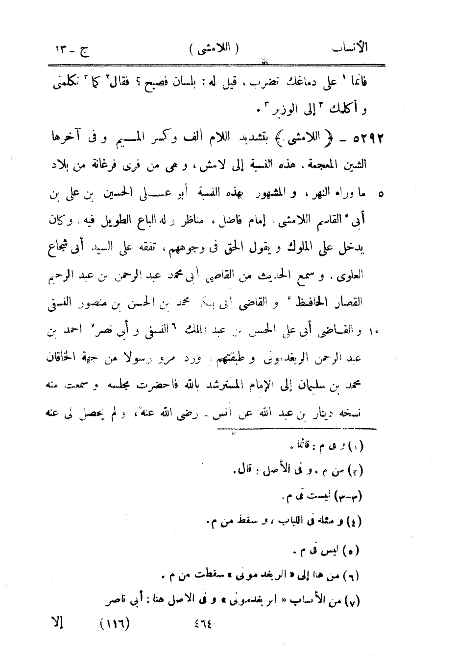 بتشديد اللام ألف وكسر الميم وفي آخرها الشين المعجمة، هذه النسبة إلى لامش، وهي من قرى فرغانة من بلاد ما وراء النهر [4] ، والمشهور بهذه النسبة أبو على الحسين بن على بن أبى [5] القاسم اللامشي، إمام فاضل، مناظر وله الباع الطويل فيه، وكان يدخل على الملوك ويقول الحق في وجوههم، تفقه على السيد أبى شجاع العلويّ، وسمع الحديث من القاضي أبى محمد عبد الرحمن بن عبد الرحيم القصار الحافظ [5] والقاضي ابى بكر محمد بن الحسن بن منصور النسفي والقاضي أبى على الحسن بن عبد الملك [6] النسفي وأبى نصر [7] أحمد بن عبد الرحمن الرِيْغْدَمُوني وطبقتهم، ورد مرو رسولا من جهة الخاقان محمد بن سليمان إلى الإمام المسترشد باللَّه فأحضرت مجلسه وسمعت منه نسخه دينار بن عبد الله عن أنس- رضى الله عنه، ولم يحصل لي عنه