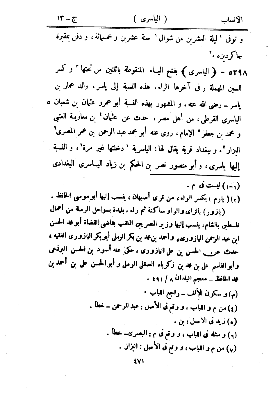 بفتح الياء المنقوطة باثنتين من تحتها [3] وكسر السين المهملة وفي آخرها الراء، هذه النسبة إلى ياسر، والد عمار بن ياسر- رضى الله عنه، والمشهور بهذه النسبة أبو عمرو عثمان بن شعبان الياسرى القرطي، من أهل مصر، حدث عن عثمان [4] بن معاوية العتبى ومحمد بن جعفر [5] الإمام، روى عنه أبو محمد عبد الرحمن بن عمر المصري [6] البزار [7] . وببغداد قرية يقال لها: الياسرية [1] دخلتها غير مرة [1] ، والنسبة إليها ياسرى، وأبو منصور نصر بن الحكم بن زياد الياسرى البغدادي