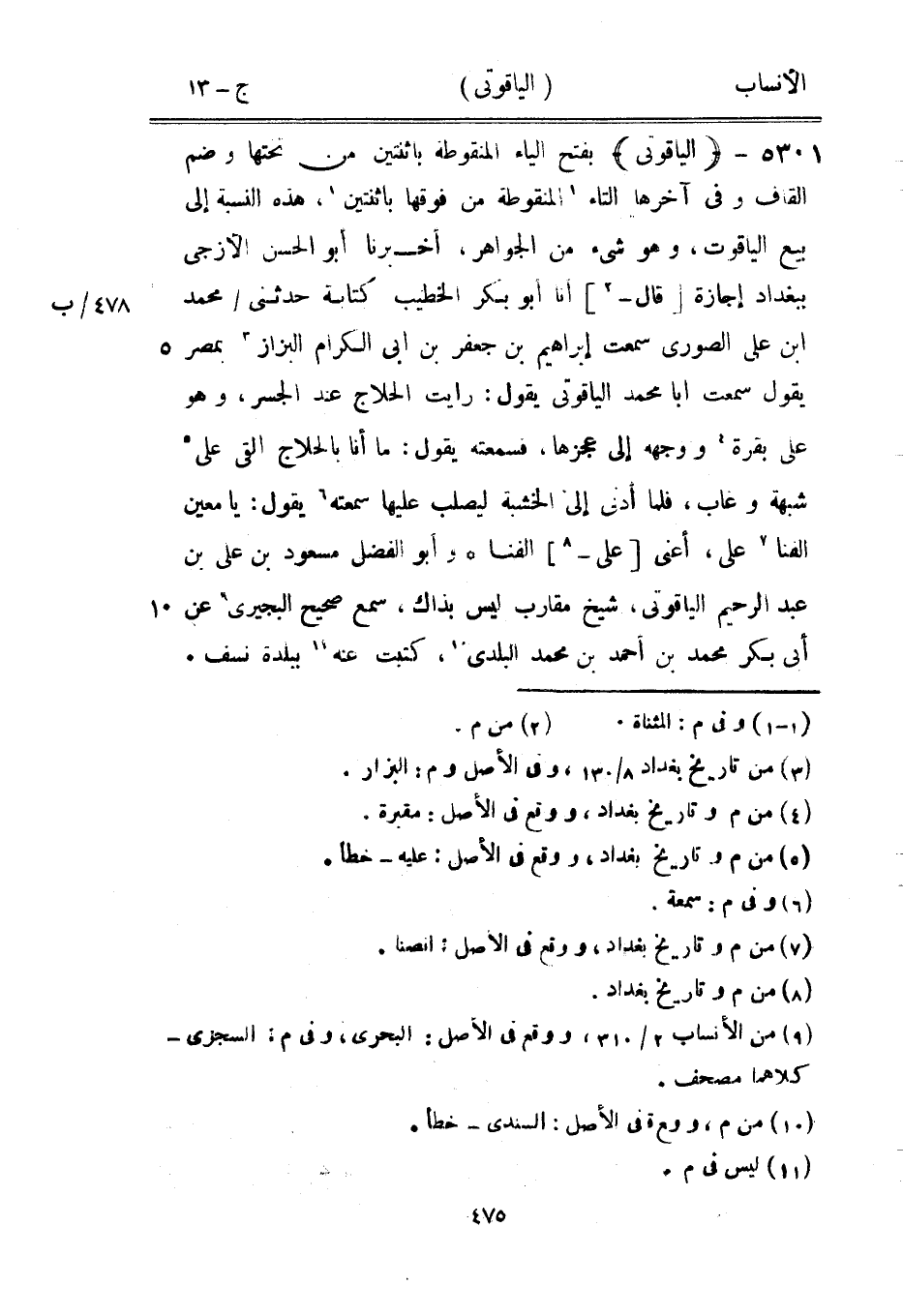 بفتح الياء المنقوطة باثنتين من تحتها وضم القاف وفي آخرها التاء [1] المنقوطة من فوقها باثنتين [1] ، هذه النسبة إلى بيع الياقوت، وهو شيء من الجواهر، أخبرنا أبو الحسن الأزجي ببغداد إجازة [قال-[2]] أنا أبو بكر الخطيب كتابة حدثني/ محمد ابن على الصوري سمعت إبراهيم بن جعفر بن ابى الكرام البزاز [3] بمصر يقول سمعت ابا محمد الياقوتى يقول: رأيت الحلاج عند الجسر، وهو على بقرة [4] ووجهه إلى عجزها، فسمعته يقول: ما أنا بالحلاج ألقى على [5] شبهة وغاب، فلما أدنى إلى الخشبة ليصلب عليها سمعته [6] يقول: يا معين الفنا [7] على، أعنى [على-[8]] الفنا وأبو الفضل مسعود بن على بن عبد الرحيم الياقوتى، شيخ مقارب ليس بذاك، سمع صحيح البجيري [9] عن أبى بكر محمد بن أحمد بن محمد البلدي [10] ، كتبت عنه [11] ببلدة نسف.