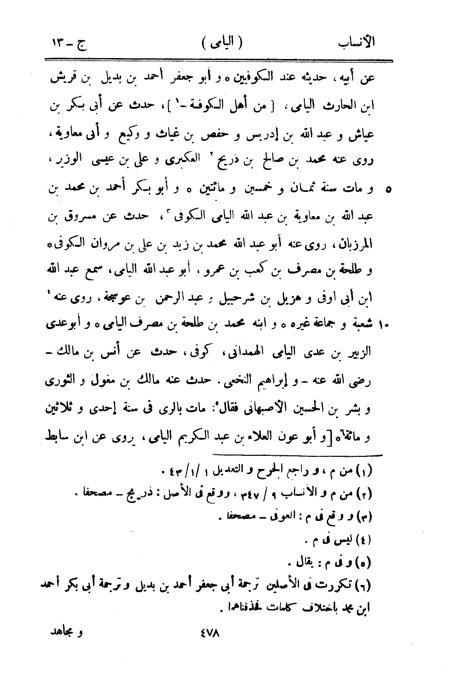 عن أبيه، حديثه عند الكوفيين وأبو جعفر أحمد بن بديل بن قريش ابن الحارث اليامى، [من أهل الكوفة-[1]] ، حدث عن أبى بكر بن عياش وعبد الله بن إدريس وحفص بن غياث ووكيع، وأبى معاوية، روى عنه محمد بن صالح بن ذريح [2] العكبريّ وعلى بن عيسى الوزير، ومات سنة ثمان وخمسين ومائتين وأبو بكر أحمد بن محمد بن عبد الله بن معاوية بن عبد الله اليامى الكوفي [3] ، حدث عن مسروق بن المرزبان، روى عنه أبو عبد الله محمد بن زيد بن على بن مروان الكوفي وطلحة بن مصرف بن كعب بن عمرو، أبو عبد الله اليامى، سمع عبد الله ابن أبى اوفى وهزيل بن شرحبيل وعبد الرحمن بن عوسجة، روى عنه [4] شعبة وجماعة غيره وابنه محمد بن طلحة بن مصرف اليامى وأبو عدي الزبير بن عدي اليامى الهمدانيّ، كوفى، حدث عن أنس بن مالك- رضى الله عنه- وإبراهيم النخعي، حدث عنه مالك بن مغول والثوري وبشر بن الحسين الأصبهاني فقال [5] : مات بالري في سنة إحدى وثلاثين ومائة [6] [وأبو عون العلاء بن عبد الكريم اليامى، يروى عن ابن سابط