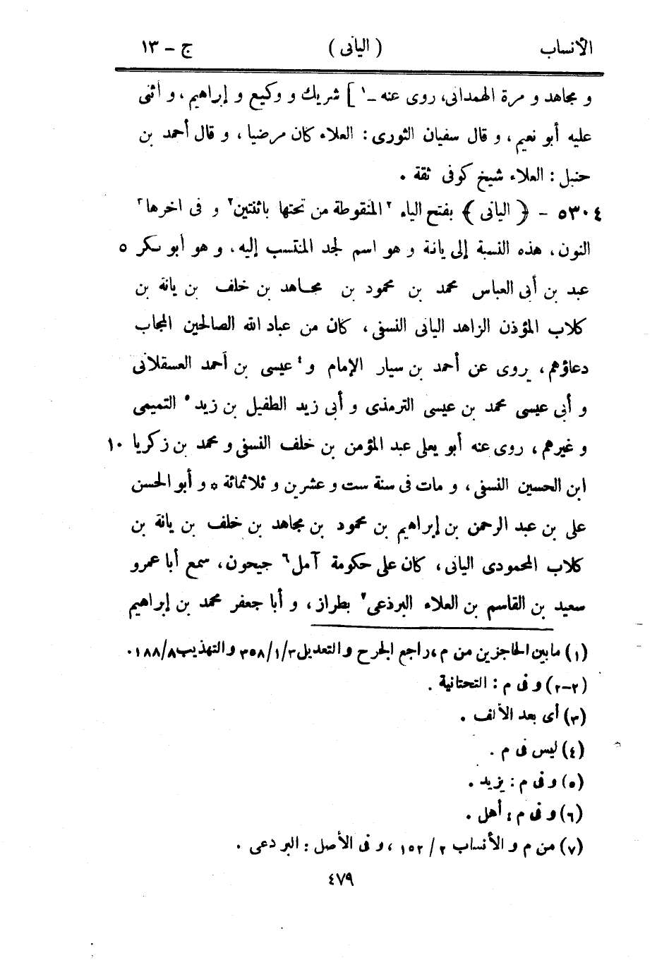 بفتح الياء [2] المنقوطة من تحتها باثنتين [2] وفي آخرها [3] النون، هذه النسبة إلى يانة وهو اسم لجد المنتسب إليه، وهو أبو بكر عبد بن أبى العباس محمد بن محمود بن مجاهد بن خلف بن يانة بن كلاب المؤذن الزاهد اليانى النسفي، كان من عباد الله الصالحين المجاب دعاؤهم، يروى عن أحمد بن سيار الإمام و [4] عيسى بن أحمد العسقلاني وأبى عيسى محمد بن عيسى الترمذي وأبى زيد الطفيل بن زيد [5] التميمي وغيرهم، روى عنه أبو يعلى عبد المؤمن بن خلف النسفي ومحمد بن زكريا ابن الحسين النسفي، ومات في سنة ست وعشرين وثلاثمائة وأبو الحسن على بن عبد الرحمن بن إبراهيم بن محمود بن مجاهد بن خلف بن يانة بن كلاب المحمودي اليانى، كان على حكومة آمل [6] جيحون، سمع أبا عمرو سعيد بن القاسم بن العلاء البرذعي [7] بطراز، وأبا جعفر محمد بن إبراهيم