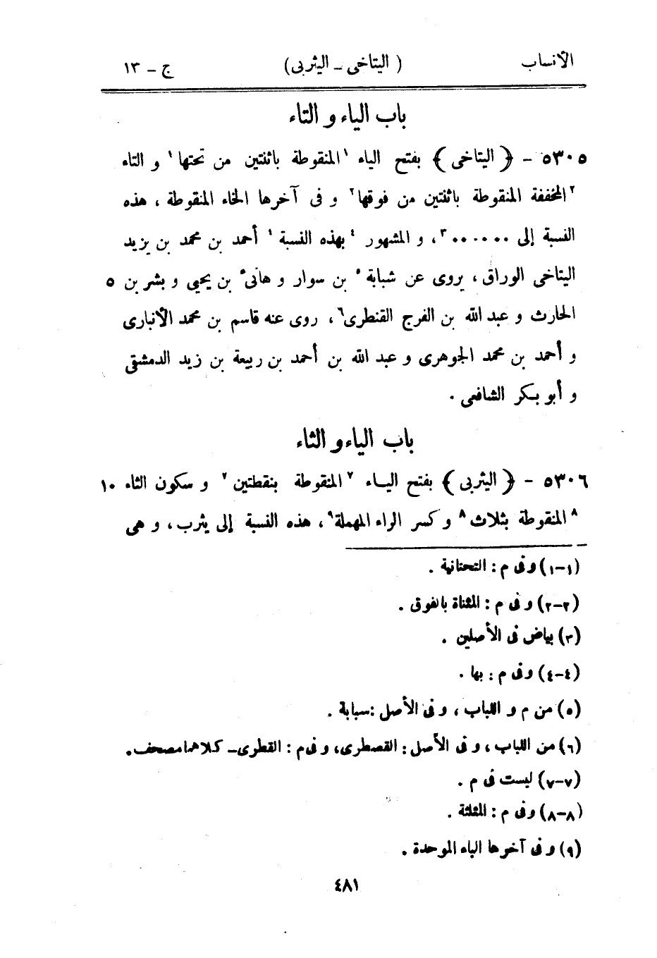 بفتح الياء [7] المنقوطة بنقطتين [7] وسكون الثاء [8] المنقوطة بثلاث [8] وكسر الراء المهملة [9] ، هذه النسبة إلى يثرب، وهي