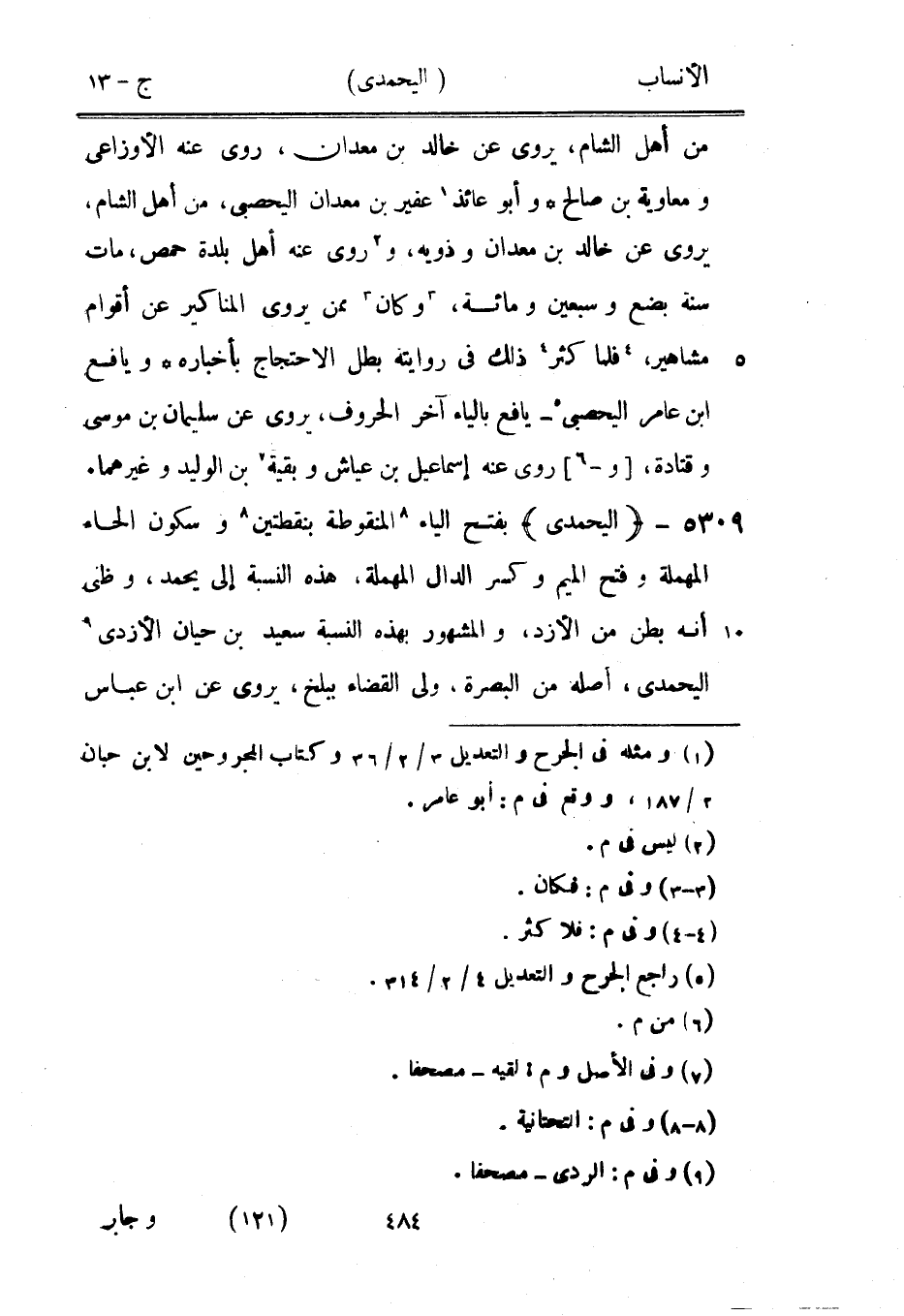 بفتح الياء [8] المنقوطة بنقطتين [8] وسكون الحاء المهملة وفتح الميم وكسر الدال المهملة، هذه النسبة إلى يحمد، وظني أنه بطن من الأزد، والمشهور بهذه النسبة سعيد بن حيان الأزدي [9] اليحمدى، أصله من البصرة، ولى القضاء ببلخ، يروى عن ابن عباس