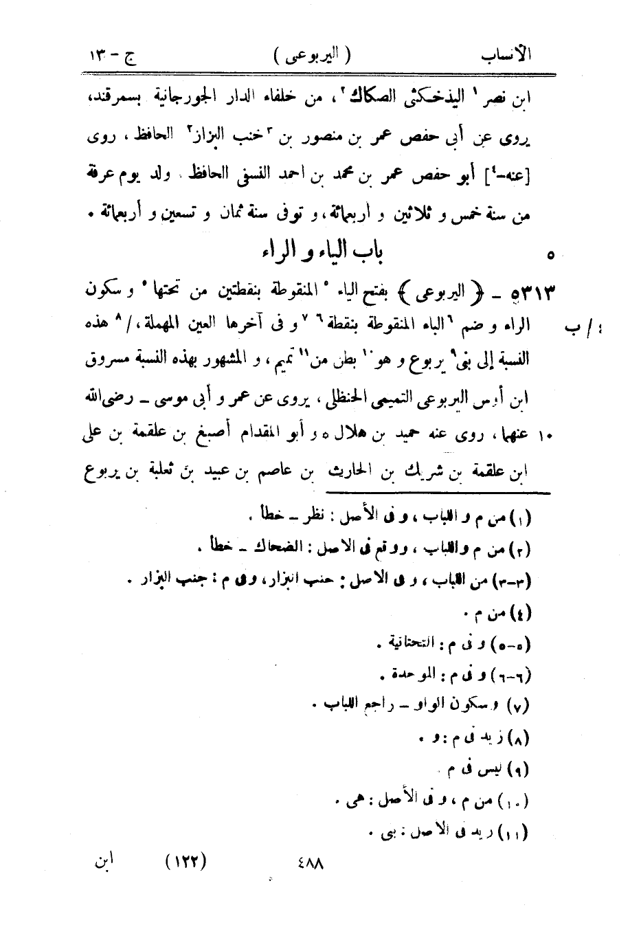 بفتح الياء [5] المنقوطة بنقطتين من تحتها [5] وسكون الراء وضم [6] الباء المنقوطة بنقطة [6] [7] وفي آخرها العين المهملة،/ [8] هذه النسبة إلى بنى [9] يربوع وهو [10] بطن من [11] تميم، والمشهور بهذه النسبة مسروق ابن أوس اليربوعي التميمي الحنظليّ، يروى عن عمر وأبى موسى- رضى الله عنهما، روى عنه حميد بن هلال وأبو المقدام أصبغ بن علقمة بن على ابن علقمة بن شريك بن الحارث بن عاصم بن عبيد بن ثعلبة بن يربوع