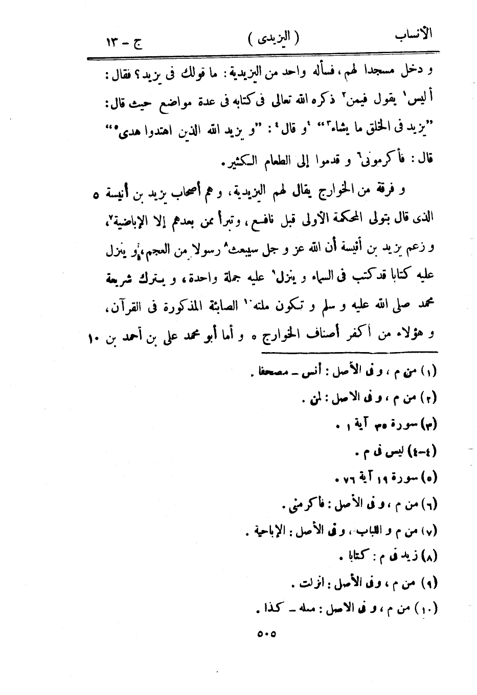 وفرقة من الخوارج يقال لهم اليزيدية، وهم أصحاب يزيد بن أنيسة الّذي قال بتولي المحكمة الأولى قبل نافع، وتبرأ ممن بعدهم إلا الإباضية [7] ، وزعم يزيد بن أنيسة أن الله عز وجل سيبعث [8] رسولا من العجم، وينزل عليه كتابا قد كتب في السماء وينزل [9] عليه جملة واحدة، ويترك شريعة محمد صلى الله عليه وسلم وتكون ملته [10] الصابئة المذكورة في القرآن، وهؤلاء من أكفر أصناف الخوارج وأما أبو محمد على بن أحمد بن