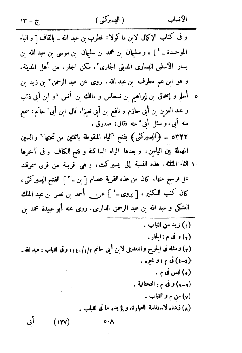 وفي كتاب الإكمال لابن ماكولا: قطرب بن عبد الله- بالقاف [والباء الموحدة-[1]] وسليمان بن محمد بن سليمان بن موسى بن عبد الله بن يسار الأسلمي اليسارى المديني الجاري [2] ، سكن الجار، من أهل المدينة، وهو ابن عم مطرف بن عبد الله، روى عن عبد الرحمن [3] بن زيد بن أسلم وإسحاق بن إبراهيم بن نسطاس ومالك بن أنس [4] وابن أبى ذئب وعبد العزيز بن أبى حازم ونافع بن أبى نعيم [4] ، قال ابن أبى [5] حاتم: سمع منه أبى، وسئل أبى [5] عنه فقال: صدوق.