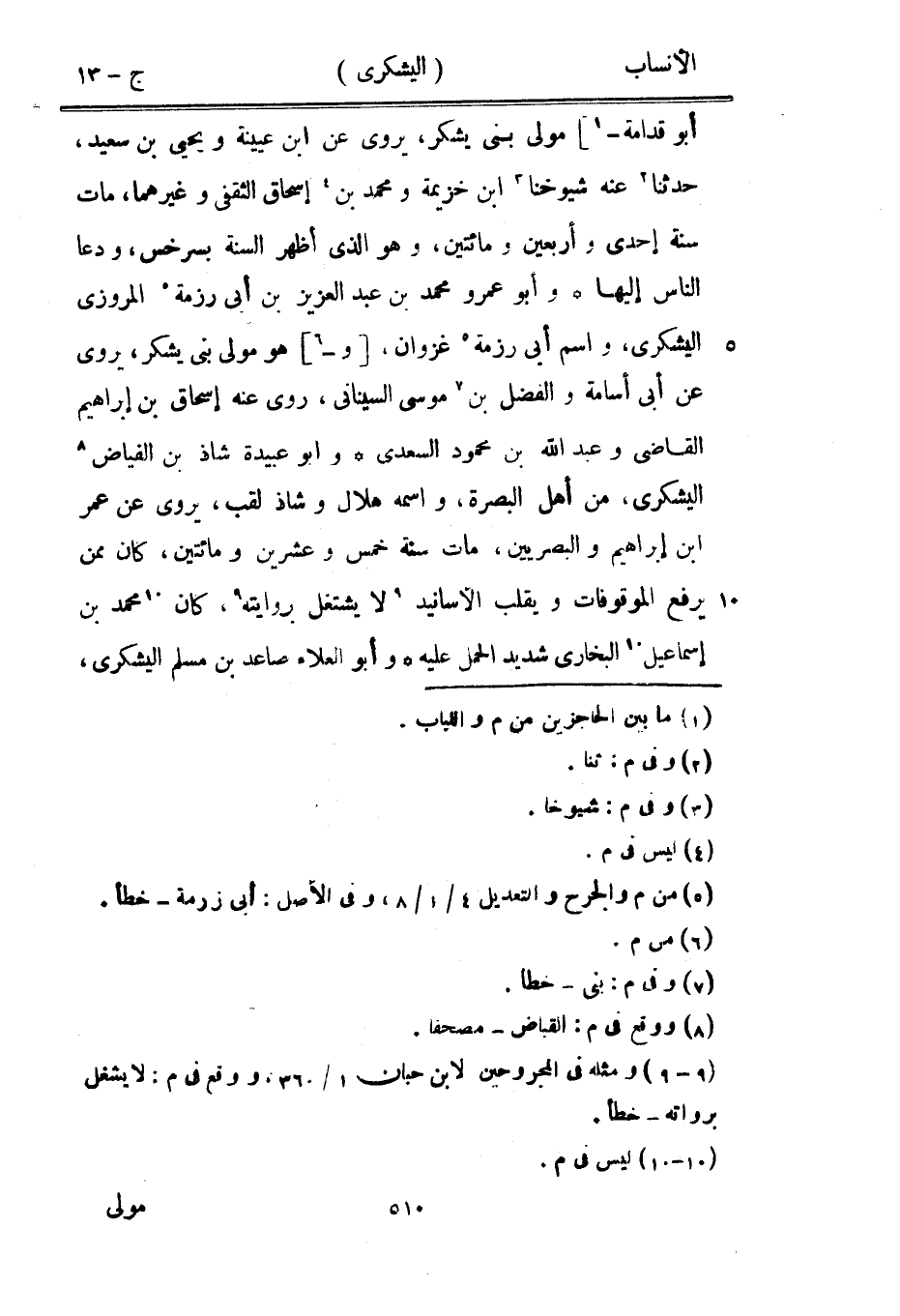 أبو قدامة-[1]] مولى بنى يشكر، يروى عن ابن عيينة ويحيى بن سعيد، حدثنا [2] عنه شيوخنا [3] ابن خزيمة ومحمد بن [4] إسحاق الثقفي وغيرهما، مات سنة إحدى وأربعين ومائتين، وهو الّذي أظهر السنة بسرخس، ودعا الناس إليها وأبو عمرو محمد بن عبد العزيز بن أبى رزمة [5] المروزي اليشكري، واسم أبى رزمة [5] غزوان، [و-[6]] هو مولى بنى يشكر، يروى عن أبى أسامة والفضل بن [7] موسى السينانى، روى عنه إسحاق بن إبراهيم القاضي وعبد الله بن محمود السعدي وابو عبيدة شاذ بن الفياض [8] اليشكري، من أهل البصرة، واسمه هلال وشاذ لقب، يروى عن عمر ابن إبراهيم والبصريين، مات سنة خمس وعشرين ومائتين، كان ممن يرفع الموقوفات ويقلب الأسانيد [9] لا يشتغل بروايته [9] ، كان [10] محمد بن إسماعيل [10] البخاري شديد الحمل عليه وأبو العلاء صاعد بن مسلم اليشكري،