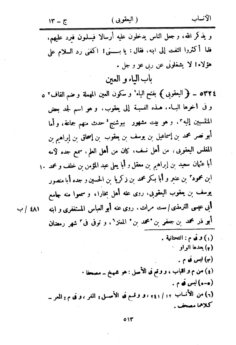 بفتح الياء [1] وسكون العين المهملة وضم القاف [2] وفي آخرها الباء، هذه النسبة إلى يعقوب، وهو اسم لجد بعض المنتسبين إليه [3] ، وهو بيت مشهور ببوشنج [4] حدث منهم جماعة، وأما أبو نصر محمد بن إسماعيل بن يوسف بن يعقوب بن إسحاق بن إبراهيم بن المغلس اليعقوبي، من أهل نسف، كان من أهل العلم، سمع جده لأمه أبا عثمان سعيد بن إبراهيم بن معقل وأبا يعلى عبد المؤمن بن خلف ومحمد ابن محمود [3] بن عنبر وأبا بكر محمد بن زكريا بن الحسين وجده أبا منصور يوسف بن يعقوب اليعقوبي، روى عنه أهل بخارا، وسمعوا منه جامع أبى عيسى الترمذي/ ست مرات، روى عنه أبو العباس المستغفري وابنه أبو ذر محمد بن جعفر بن [5] محمد بن [5] المعتز [6] ، وتوفى في [3] شهر رمضان