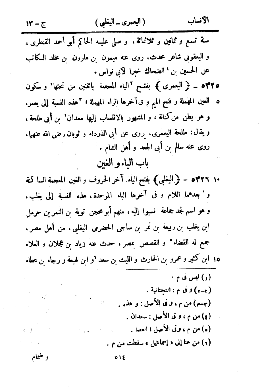 بفتح [2] الياء المعجمة باثنتين من تحتها [2] وسكون العين المهملة وفتح الميم وفي آخرها الراء المهملة، [3] هذه النسبة إلى يعمر، وهو بطن من كنانة، والمشهور بالانتساب إليها معدان [4] بن أبى طلحة، ويقال: طلحة اليعمري، يروى عن أبى الدرداء وثوبان رضى الله عنهما، روى عنه سالم بن أبى الجعد وأهل الشام.