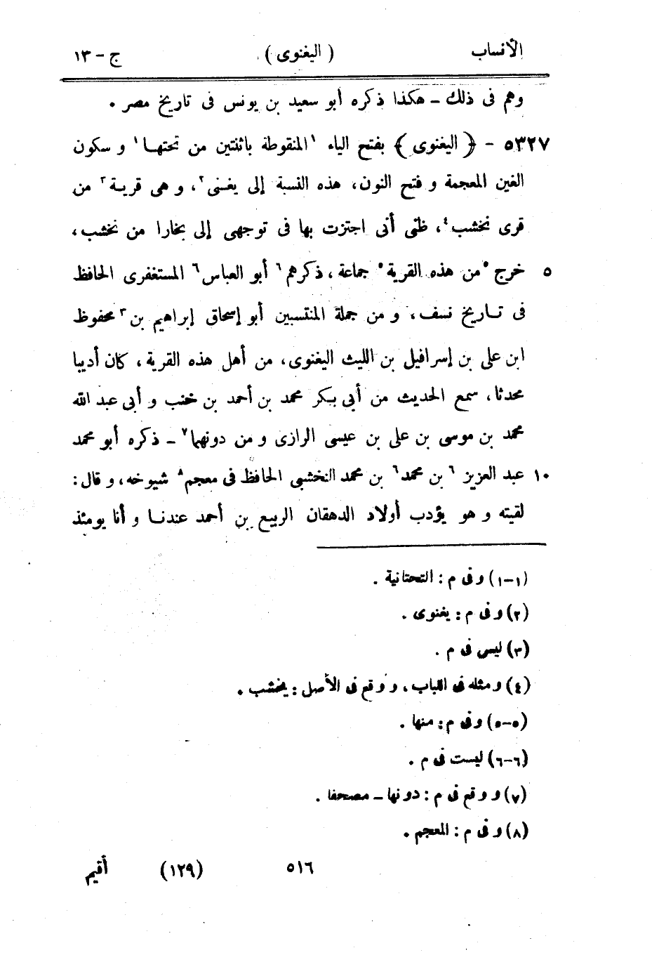 بفتح الياء [1] المنقوطة باثنتين من تحتها [1] وسكون الغين المعجمة وفتح النون، هذه النسبة إلى يغنى [2] ، وهي قرية [3] من قرى نخشب [4] ، ظني أنى اجتزت بها في توجهي إلى بخارا من نخشب، خرج [5] من هذه القرية [5] جماعة، ذكرهم [6] أبو العباس [6] المستغفري الحافظ في تاريخ نسف، ومن جملة المنتسبين أبو إسحاق إبراهيم بن [3] محفوظ ابن على بن إسرافيل بن الليث اليغنوى، من أهل هذه القرية، كان أديبا محدثا، سمع الحديث من أبى بكر محمد بن أحمد بن خنب وأبى عبد الله محمد بن موسى بن على بن عيسى الرازيّ ومن دونهما [7]- ذكره أبو محمد عبد العزيز [6] بن محمد [6] بن محمد النخشبى الحافظ في معجم [8] شيوخه، وقال: