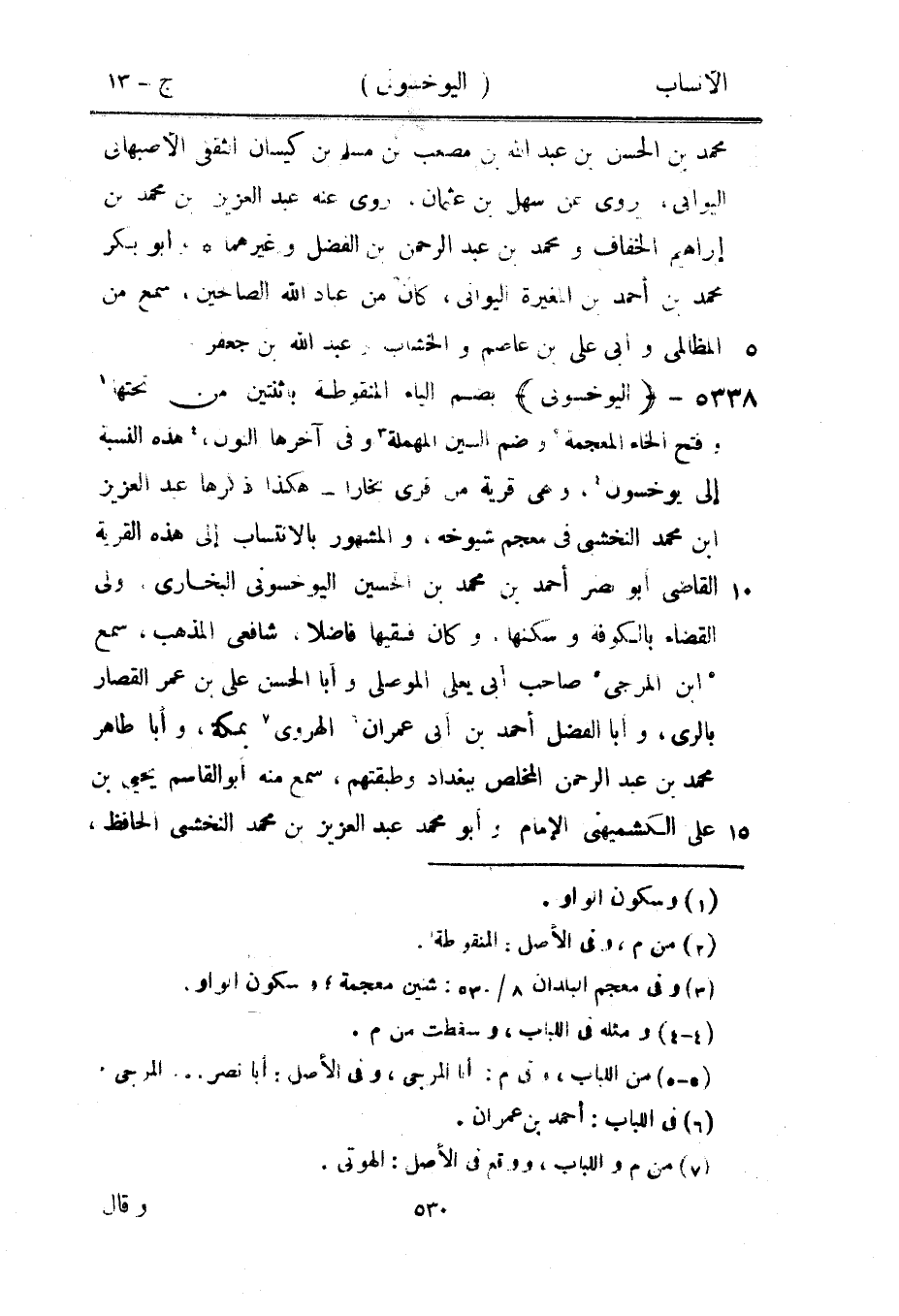 بضم الياء المنقوطة باثنتين من تحتها [1] وفتح الخاء المعجمة [2] ، وضم السين المهملة [3] وفي آخرها النون، [4] هذه النسبة إلى يوخسون [4] ، وهي قرية من قرى بخارا- هكذا ذكرها عبد العزيز ابن محمد النخشبى في معجم شيوخه، والمشهور بالانتساب إلى هذه القرية القاضي أبو نصر أحمد بن محمد بن الحسين اليوخسونى البخاري، ولى القضاء بالكوفة وسكنها، وكان فقيها فاضلا، شافعيّ المذهب، سمع [5] ابن المرجى [5] صاحب أبى يعلى الموصلي وأبا الحسن على بن عمر القصار بالري، وأبا الفضل أحمد بن أبى عمران [6] الهروي [7] بمكة، وأبا طاهر محمد بن عبد الرحمن المخلص ببغداد وطبقتهم، سمع منه أبو القاسم يحيى بن على الكشميهني الإمام وأبو محمد عبد العزيز بن محمد النخشى الحافظ،