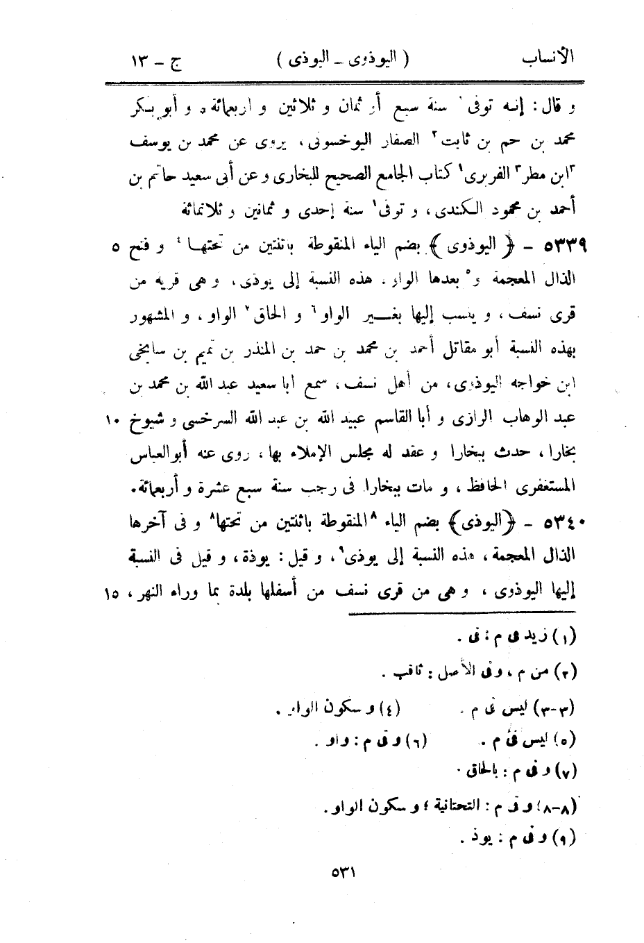 بضم الياء [8] المنقوطة باثنتين من تحتها [8] وفي آخرها الذال المعجمة، هذه النسبة إلى يوذى [9] ، وقيل: يوذة، وقيل في النسبة إليها اليوذوى، وهي من قرى نسف من أسفلها بلدة بما وراء النهر،