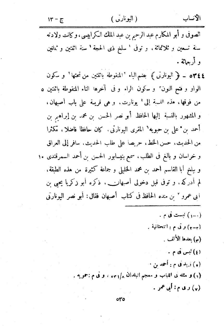 بضم الياء [2] المنقوطة باثنتين من تحتها [2] وسكون الواو وفتح النون [3] وسكون الراء وفي آخرها التاء المنقوطة باثنتين من فوقها، هذه النسبة إلى [4] يونارت، وهي قرية على باب أصبهان، والمشهور بالنسبة إليها الحافظ أبو نصر الحسن بن محمد بن إبراهيم بن أحمد بن [5] على بن حيويه [6] المقري اليونارتى، كان حافظا فاضلا، مكثرا من الحديث، حسن الخط، حريصا على طلب الحديث، سافر إلى العراق وخراسان وبالغ في الطلب، سمع بنيسابور الحسن بن أحمد السمرقندي وببلخ أبا القاسم أحمد بن محمد الخليلي وجماعة كثيرة من هذه الطبقة، لم أدركه، وتوفى قبل دخولي أصبهان، ذكره أبو زكريا يحيى بن أبى عمرو [7] بن مندة الحافظ في كتاب أصبهان فقال: أبو نصر اليونارتى