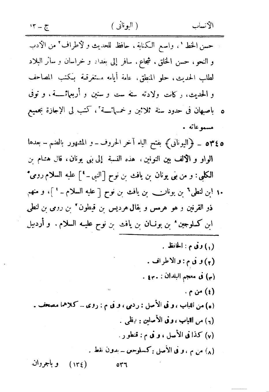 بفتح الياء آخر الحروف- والمشهور بالضم- بعدها الواو والألف بين النونين، هذه النسبة إلى بنى يونان، قال هشام بن الكلبي: ومن بنى يونان بن يافث بن نوح [النبي-[4]] عليه السلام رومي [5] ابن لنطى [6] بن يونان بن يافث بن نوح [عليه السلام-[4]] ، ومنهم ذو القرنين وهو هرمس ويقال هرديس بن قيطون [7] بن رومي بن لنطى ابن كسلوجين [8] بن يونان بن يافث بن نوح عليه السلام، وأردبيل