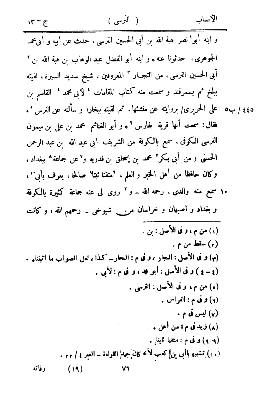 وابنه أبو [1] نصر هبة الله بن أبى الحسين النرسي، حدث عن أبيه وأبى محمد الجوهري، حدثونا عنه وابنه أبو الفضل عبد الوهاب بن هبة الله بن [2] أبى الحسين النرسي، من التجار [3] المعروفين، شيخ سديد السيرة، لقيته ببلخ ثم بسمرقند وسمعت منه كتاب المقامات [4] لأبى محمد [4] القاسم بن على الحريري/ بروايته عن منشئها، ثم لقيته ببخارا وسألته عن النرس [5] ، فقال: سمعت أنها قرية بفارس [6] وأبو الغنائم محمد بن على بن ميمون النرسي الكوفي، سمع بالكوفة من الشريف ابى عبد الله بن عبد الرحمن الحسي ومن أبى بكر [7] محمد بن إسحاق بن فدويه و [7] عن جماعة [8] ببغداد، وكان حافظا من أهل الخبر والعلم، [9] متقنا ثبتا [9] صالحا، يعرف بأبي [10] ، سمع منه والدي، رحمه الله- و [7] روى لي عنه جماعة كثيرة بالكوفة وبغداد وأصبهان وخراسان من شيوخي- رحمهم الله، وكانت